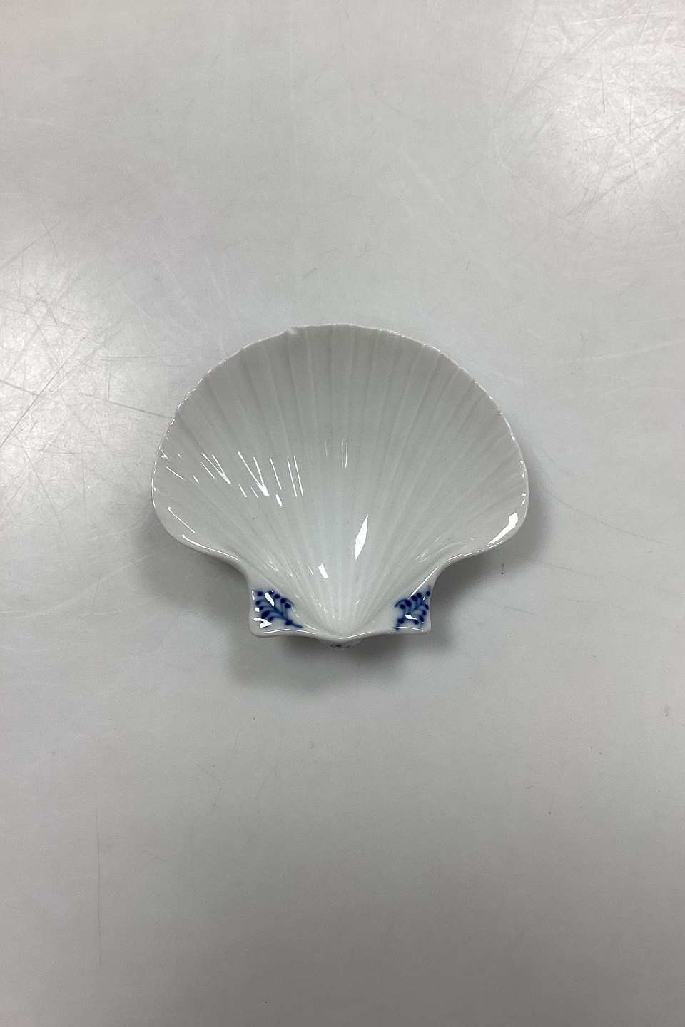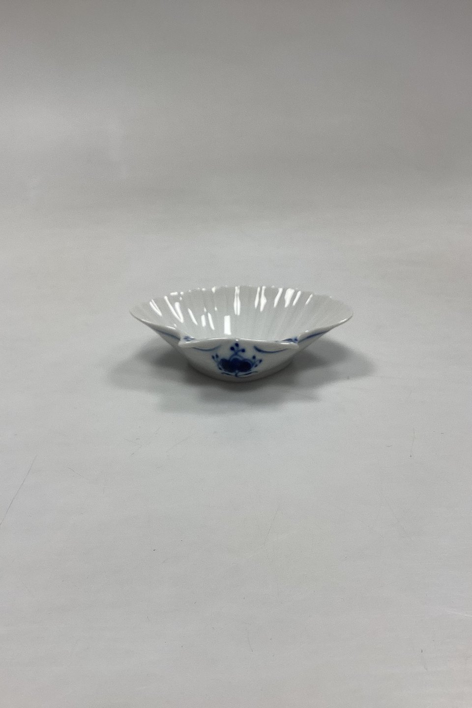 Royal Copenhagen Blue Fluted Plain Seashell Dish/Bowl No. 2032. Small chips on the edge in varying sizes, see photo.Measures 10 cm x 9 cm / 3.94 in. x 3.54 in. 1st Quality