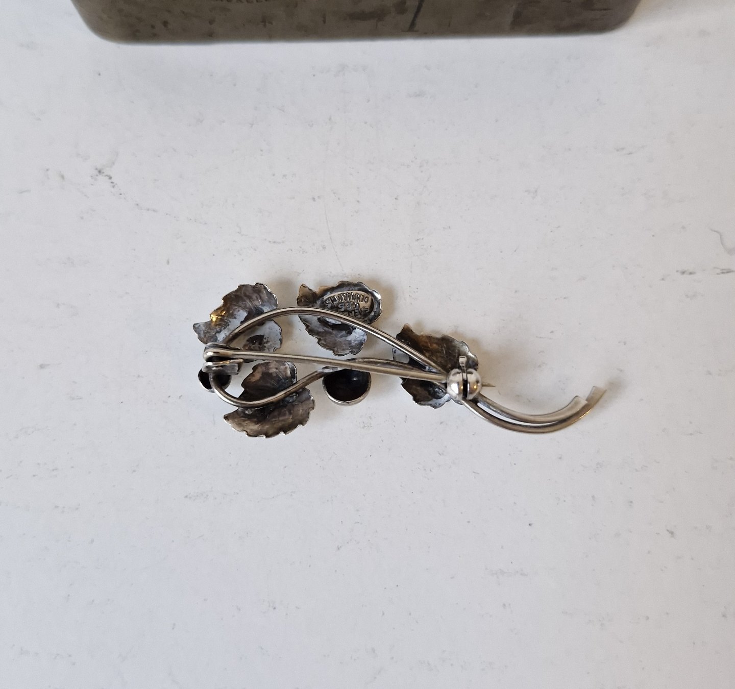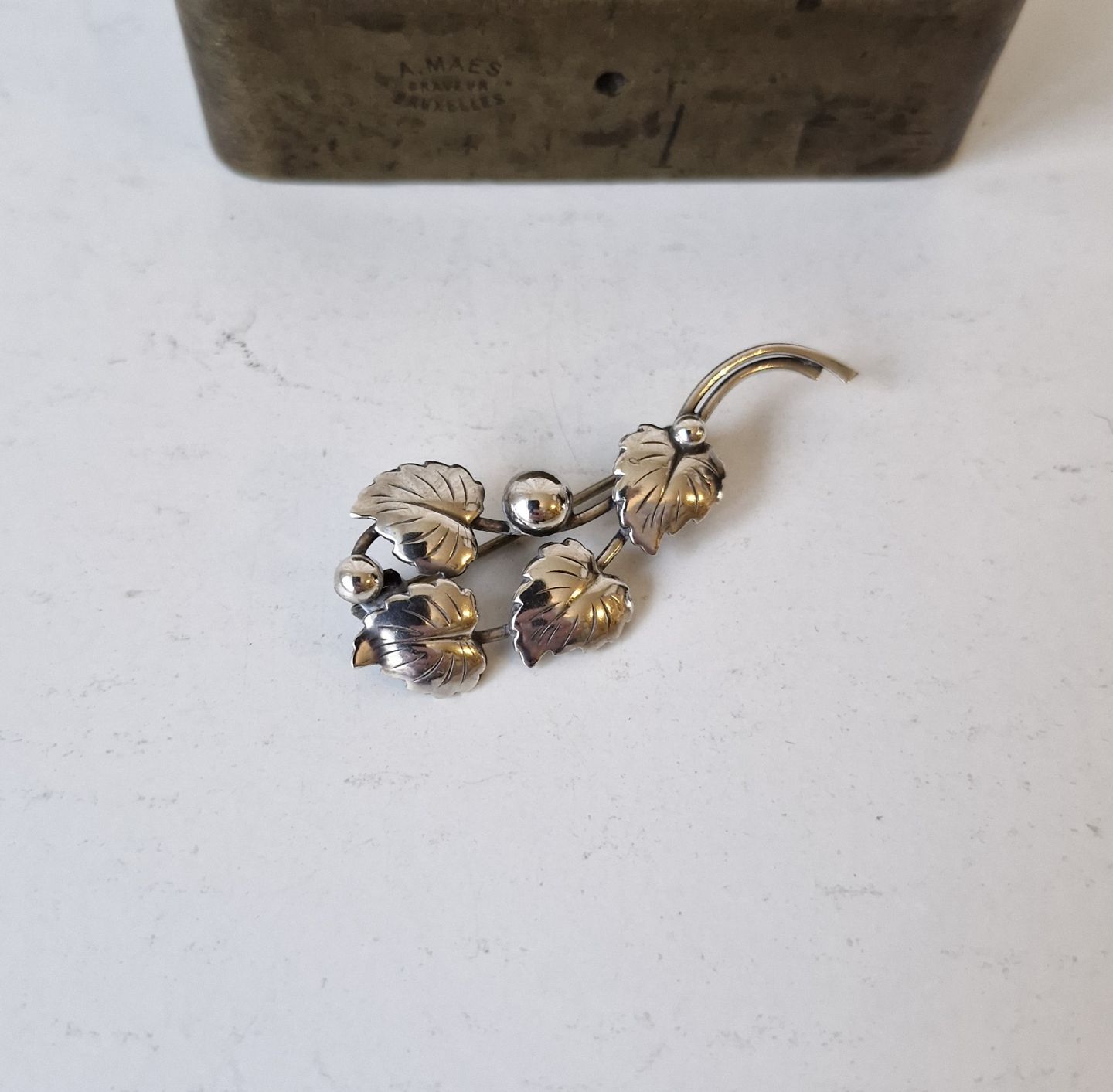 Vintage silver brooch in the shape of a branch with small leaves by Hermann SiersbølStamp: HS - Sterling - Denmark