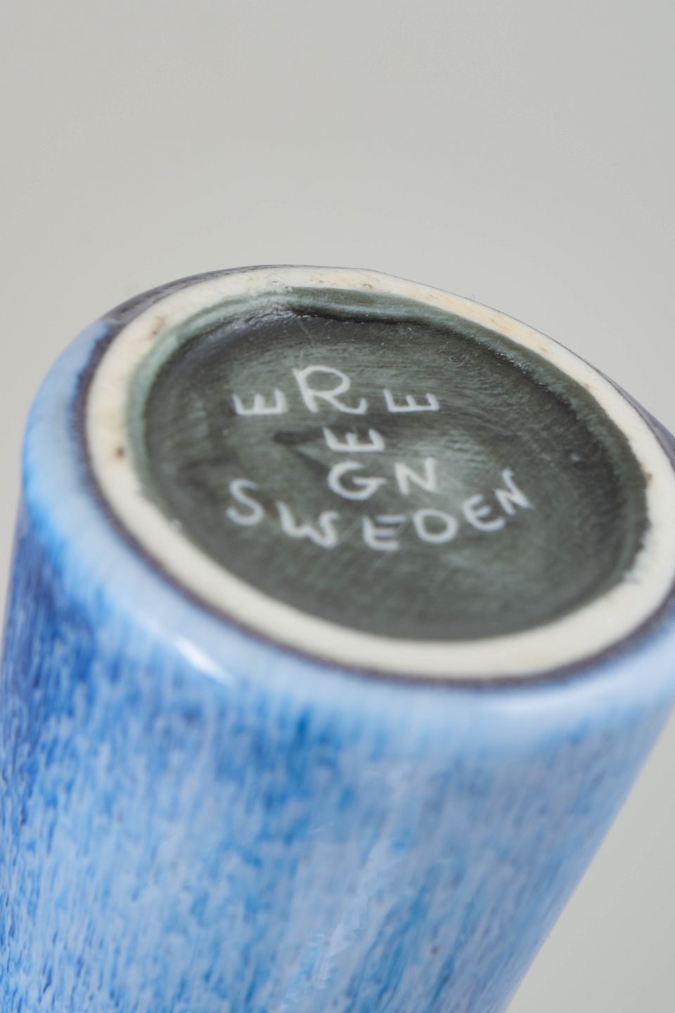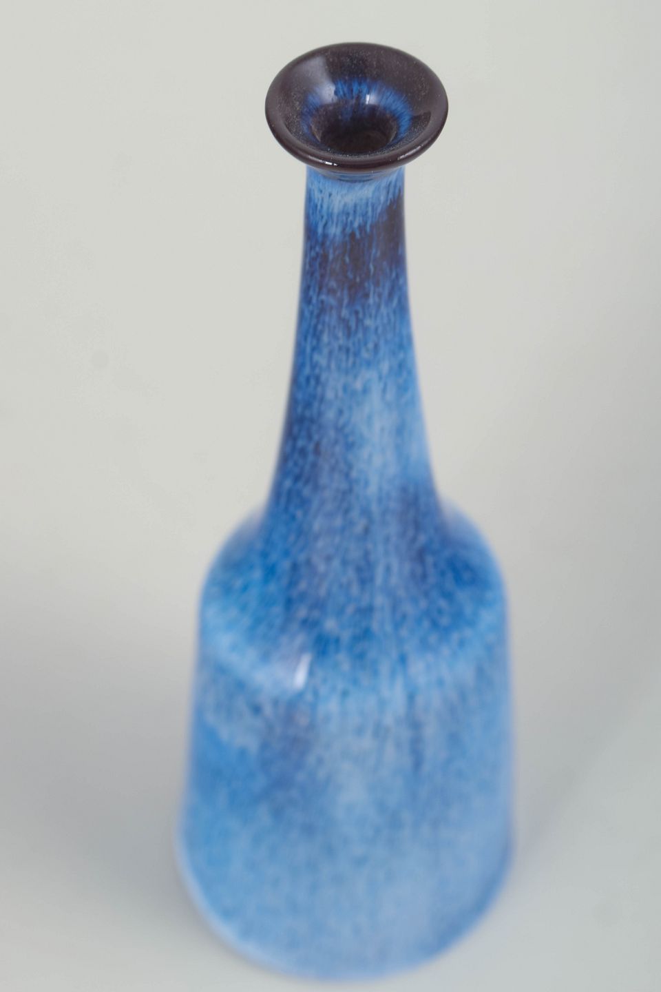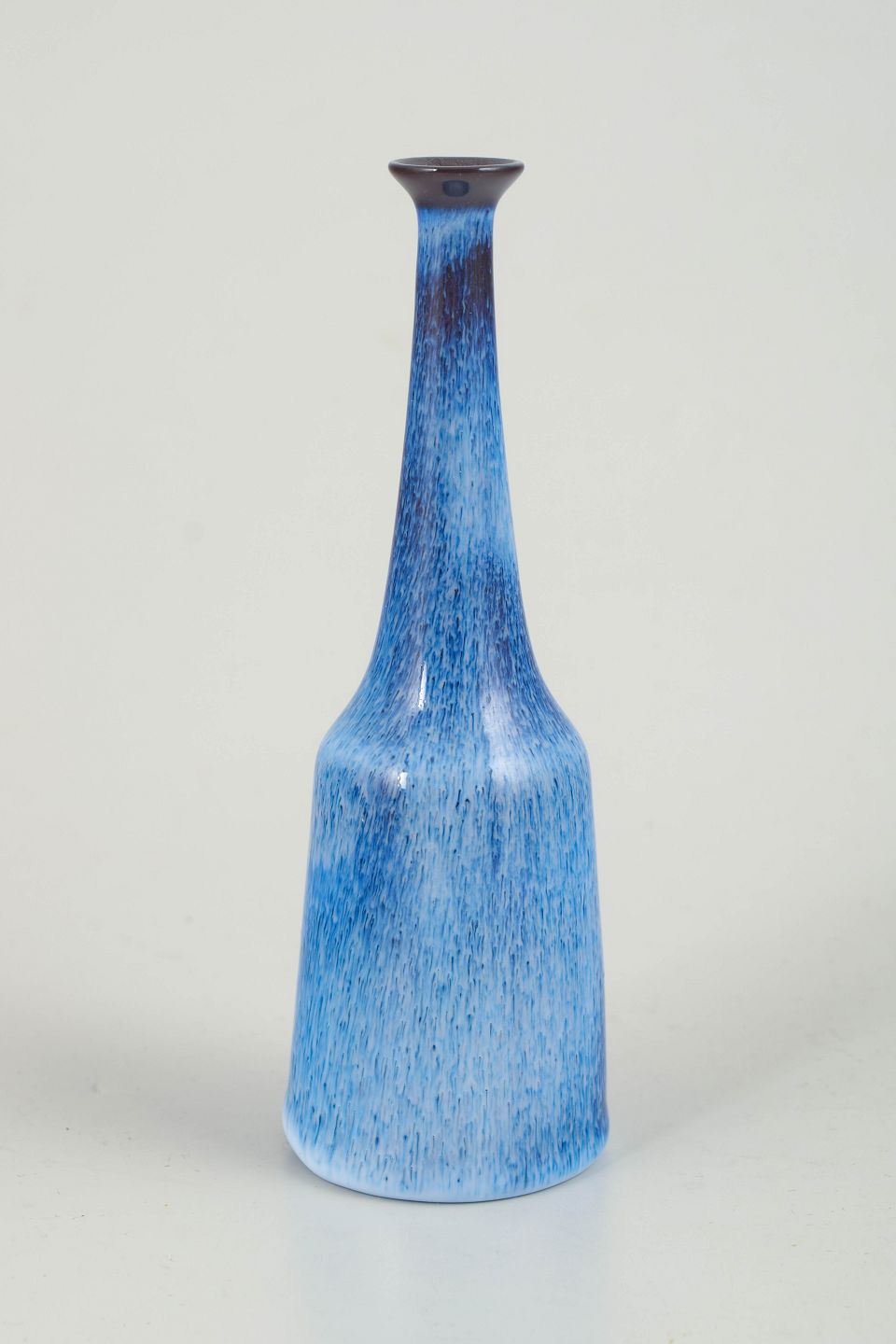 Gunnar Nylund for Rörstrand, vase.Slender vase in glazed stoneware with a long narrow neck and gently tapering body. Finished with a vibrant blue glaze showing fine vertical movement and a darker accent at the rim. Produced in first factory quality, this piece represents Gunnar Nylund’s refined work in reduced scale.