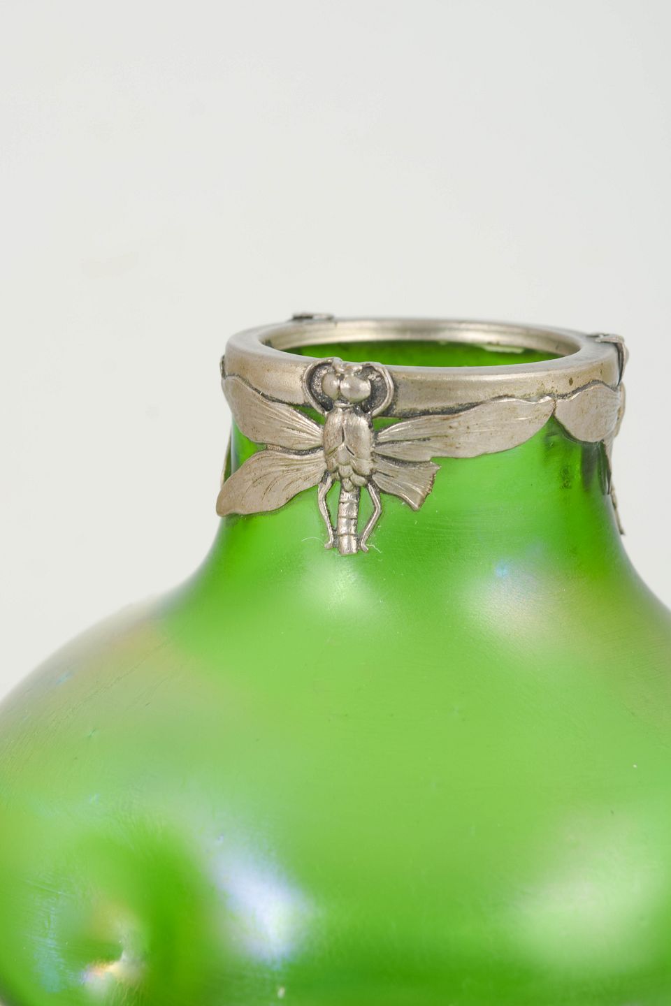 Art Nouveau vase in iridescent art glass with a vivid green ground colour and softly rounded, organic form. Low, broad body with a gently constricted neck, finished with a decorative pewter mount in a stylised, nature-inspired motif. The surface displays subtle colour play with bluish tones towards the base, typical of the period.
