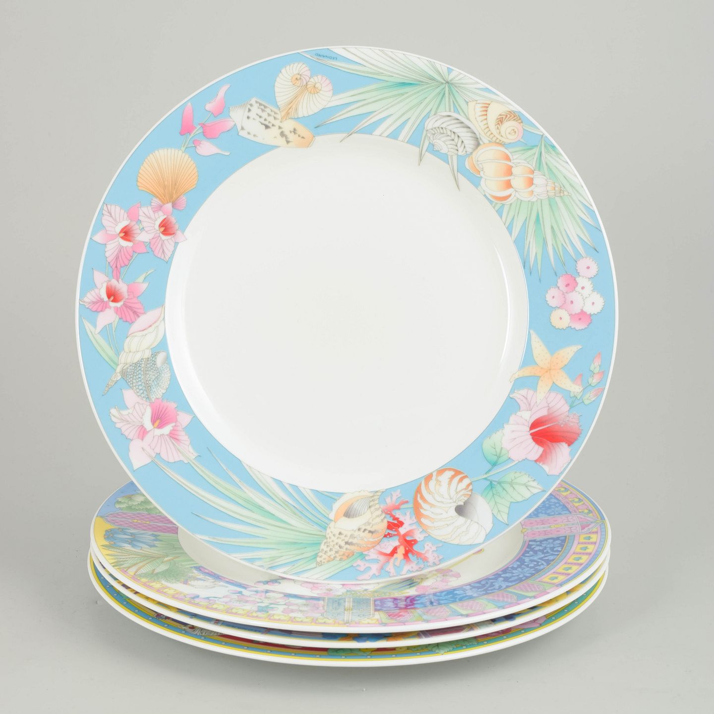 Hutschenreuther, set of 4 dinner plates.Elegant bone china set with a colourful decorative pattern. Model: Leonard Paris. Large flat plates with a wide rim, richly decorated border, and a calm white centre that highlights the graphic and international design.