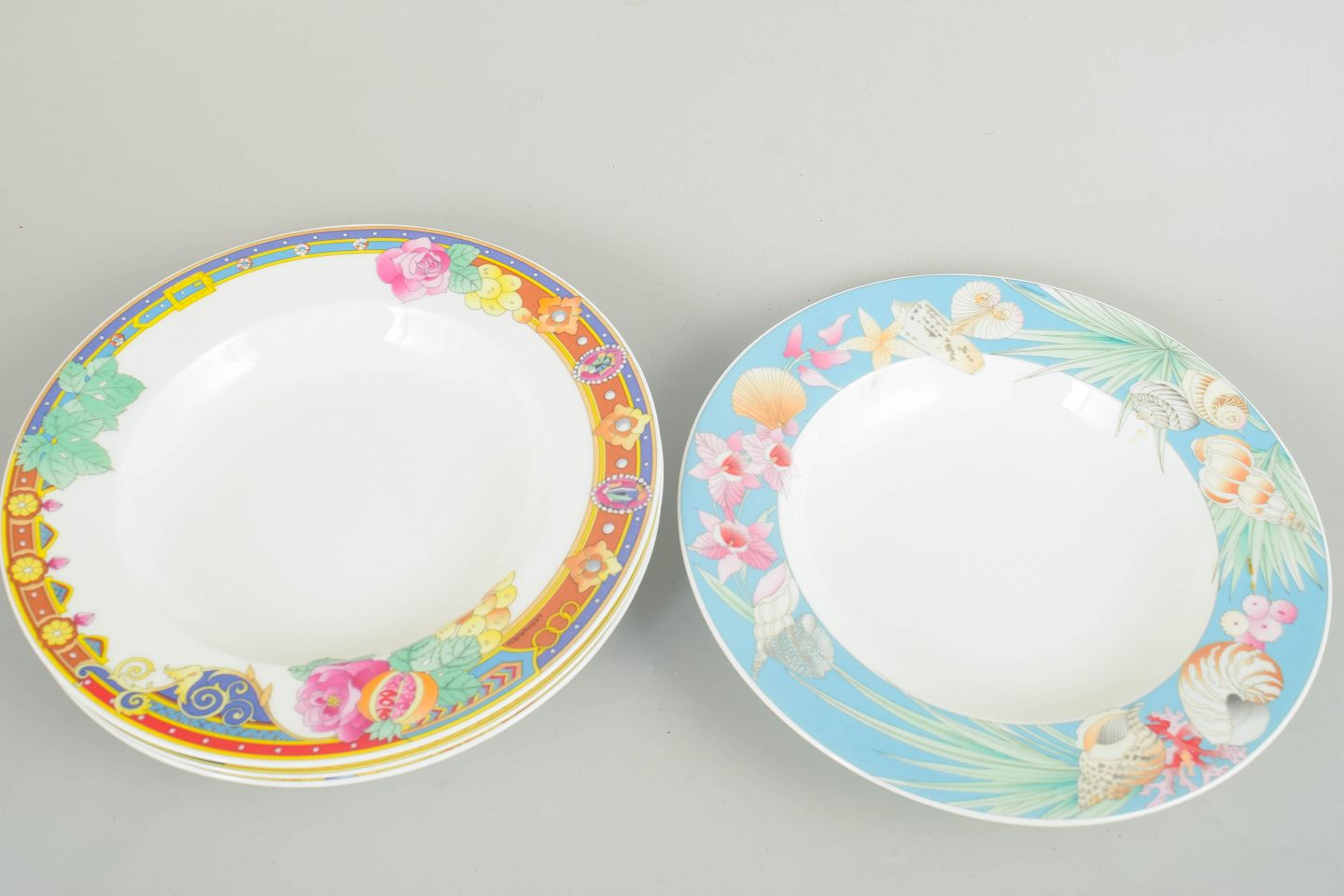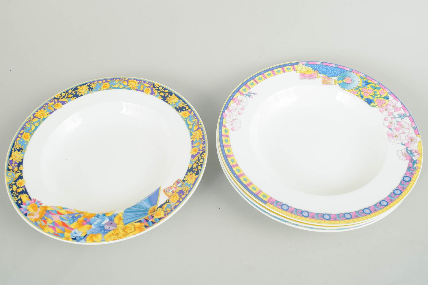 Hutschenreuther, set of 4 deep plates.Elegant bone china set with a colourful decorative pattern; the Leonard Paris model is noted in the description. Classic deep forms with a wide rim and detailed decoration along the border.