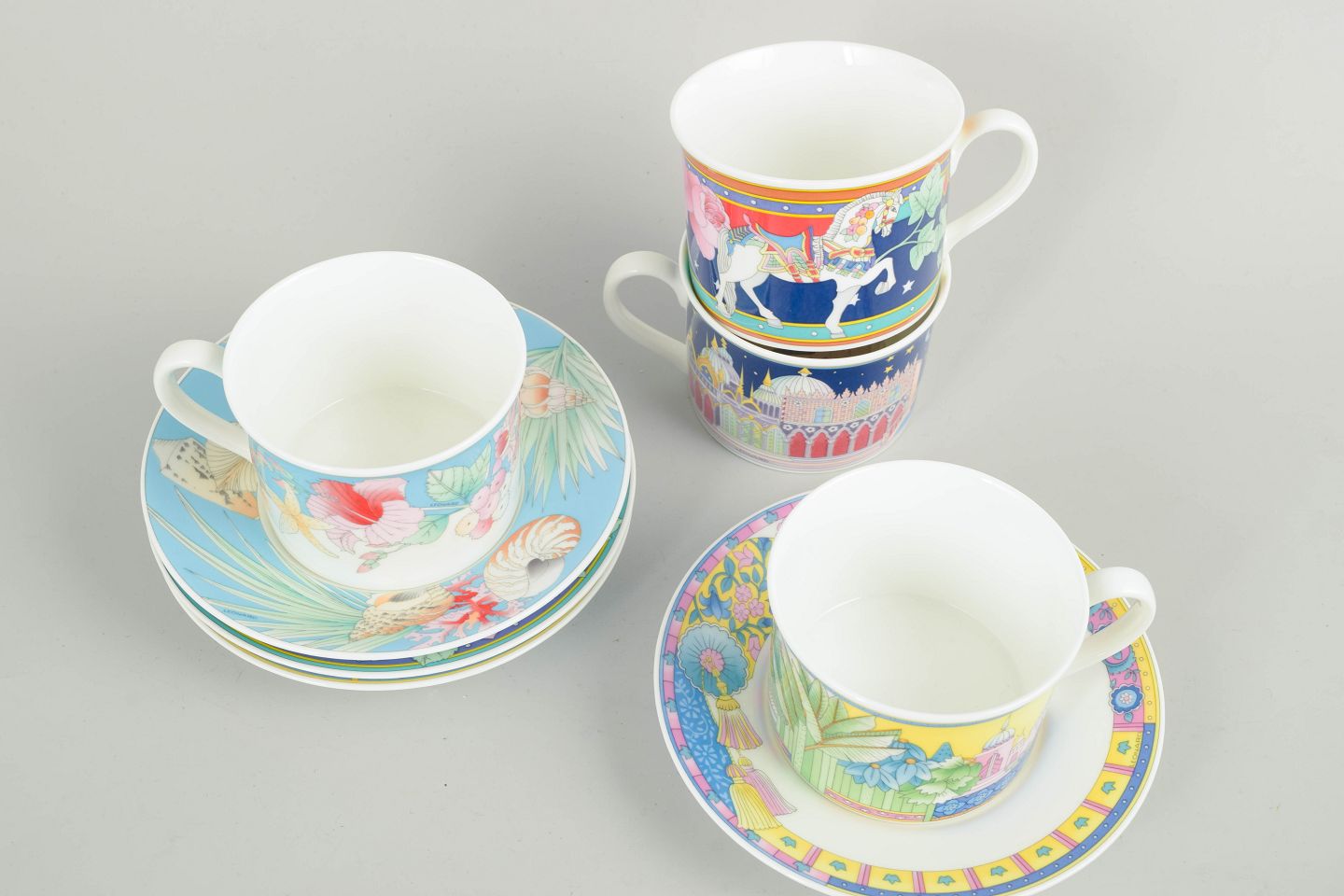 Hutschenreuther, set of 4 cups with matching saucers.Elegant bone china set with a colourful decorative pattern; the Leonard Paris model is noted in the description. Harmonious forms with a fine white glazed interior and detailed decoration on the exterior of the cups and the saucers.