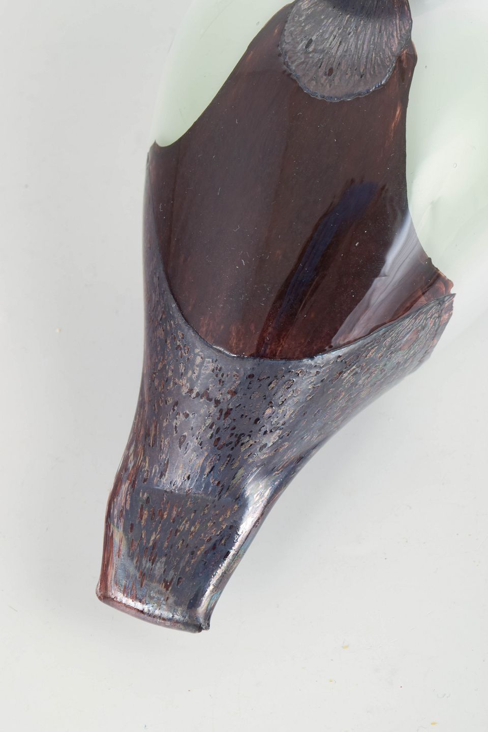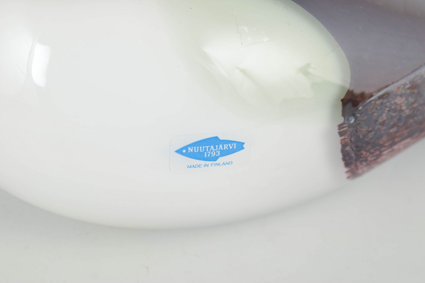 Oiva Toikka for Nuutajärvi, large bird.Large hand-blown art glass bird with an opaline white body, green-toned head, and smoky-to-violet sections with layered colour effects; a characteristic example of Finnish studio glass from the 1980s.