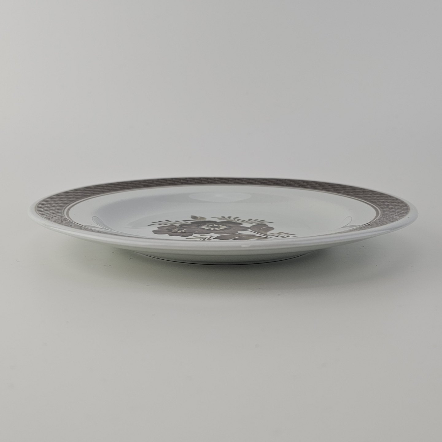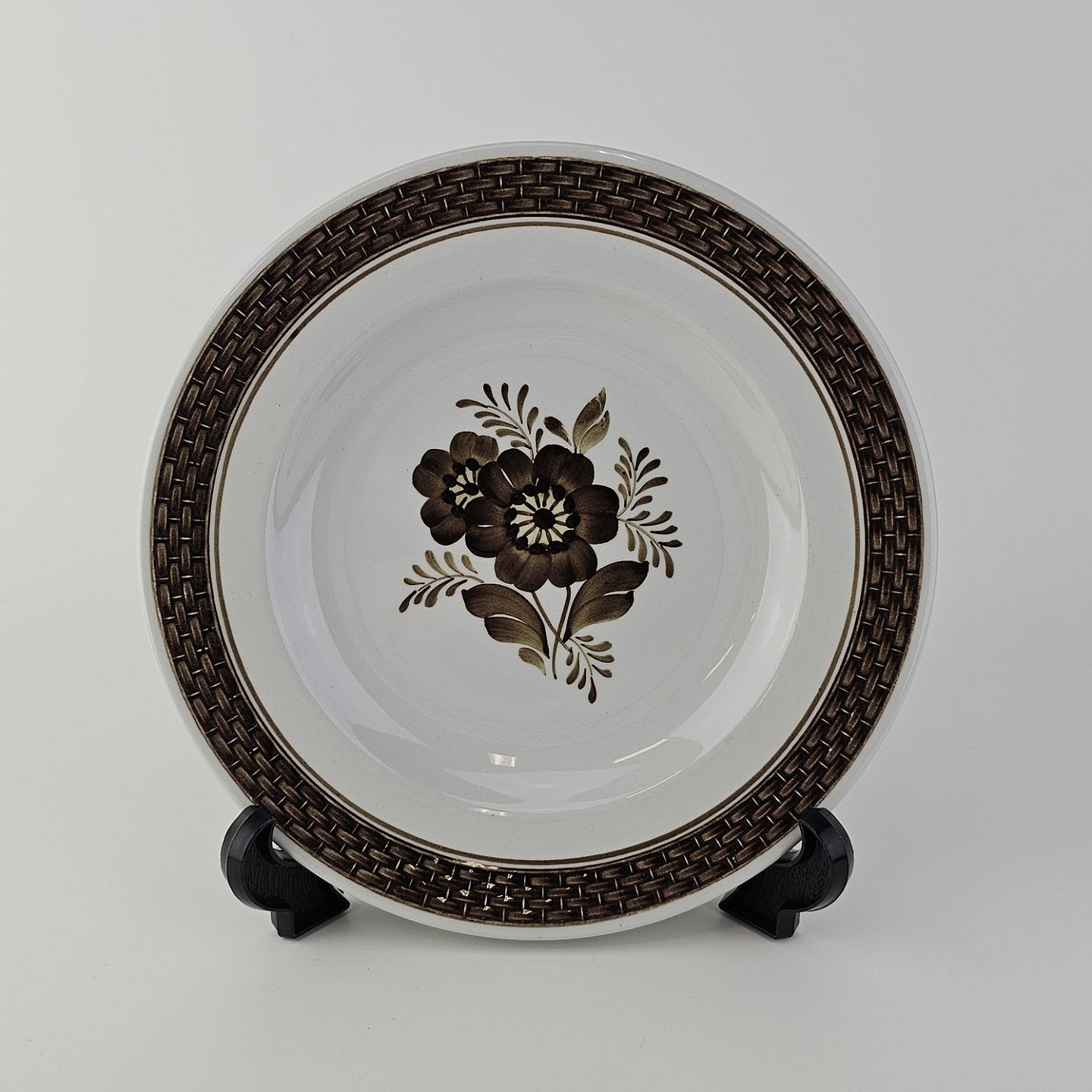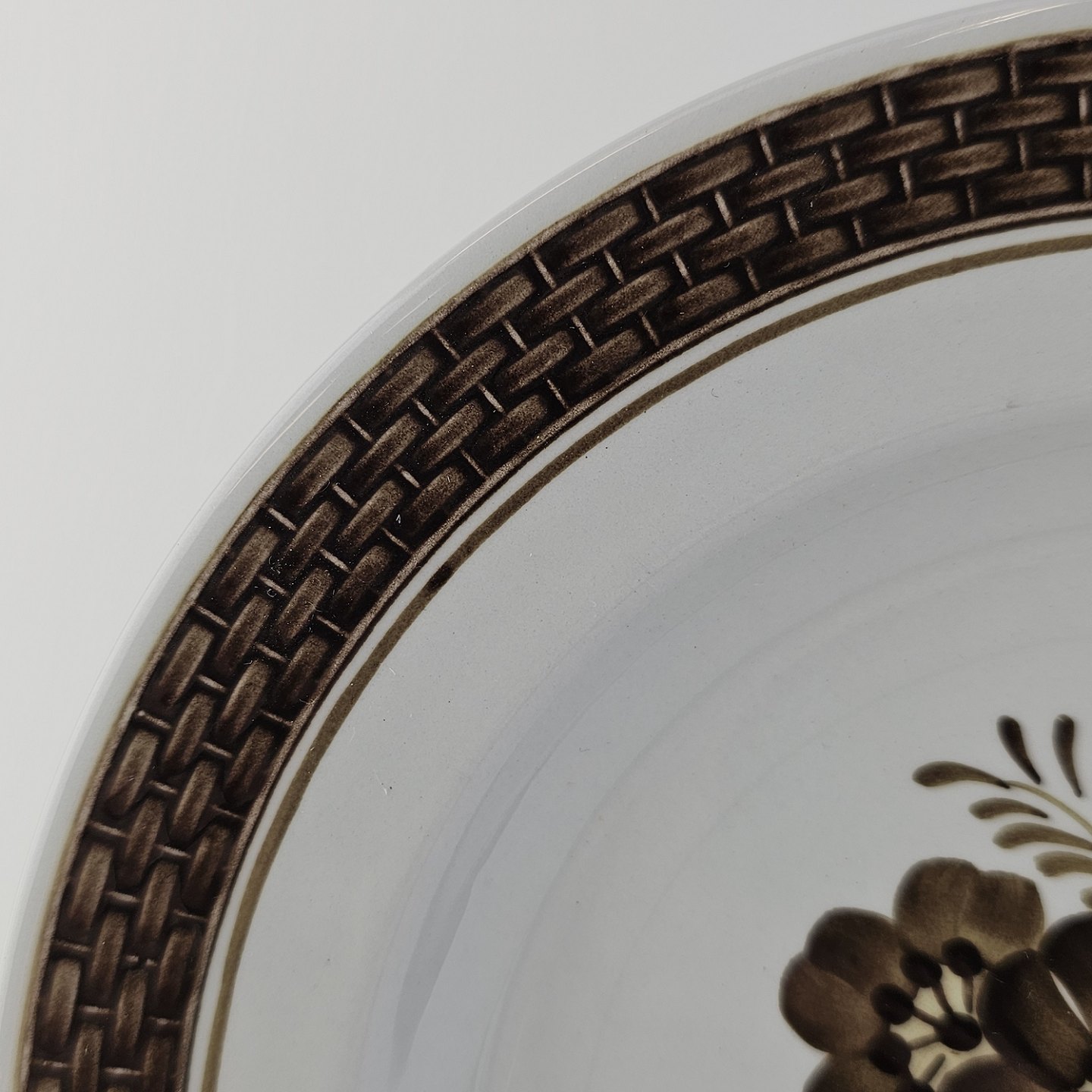 Fajancestellet med flettet kant og dekoration af brune blomster på lys baggrund med brun kant