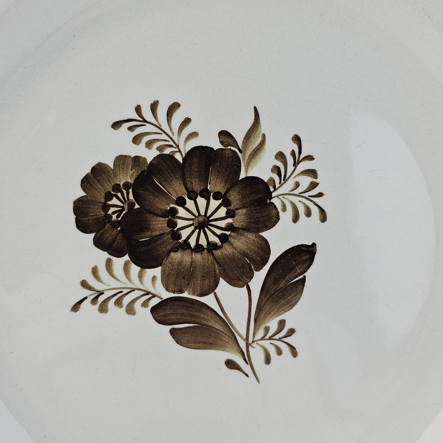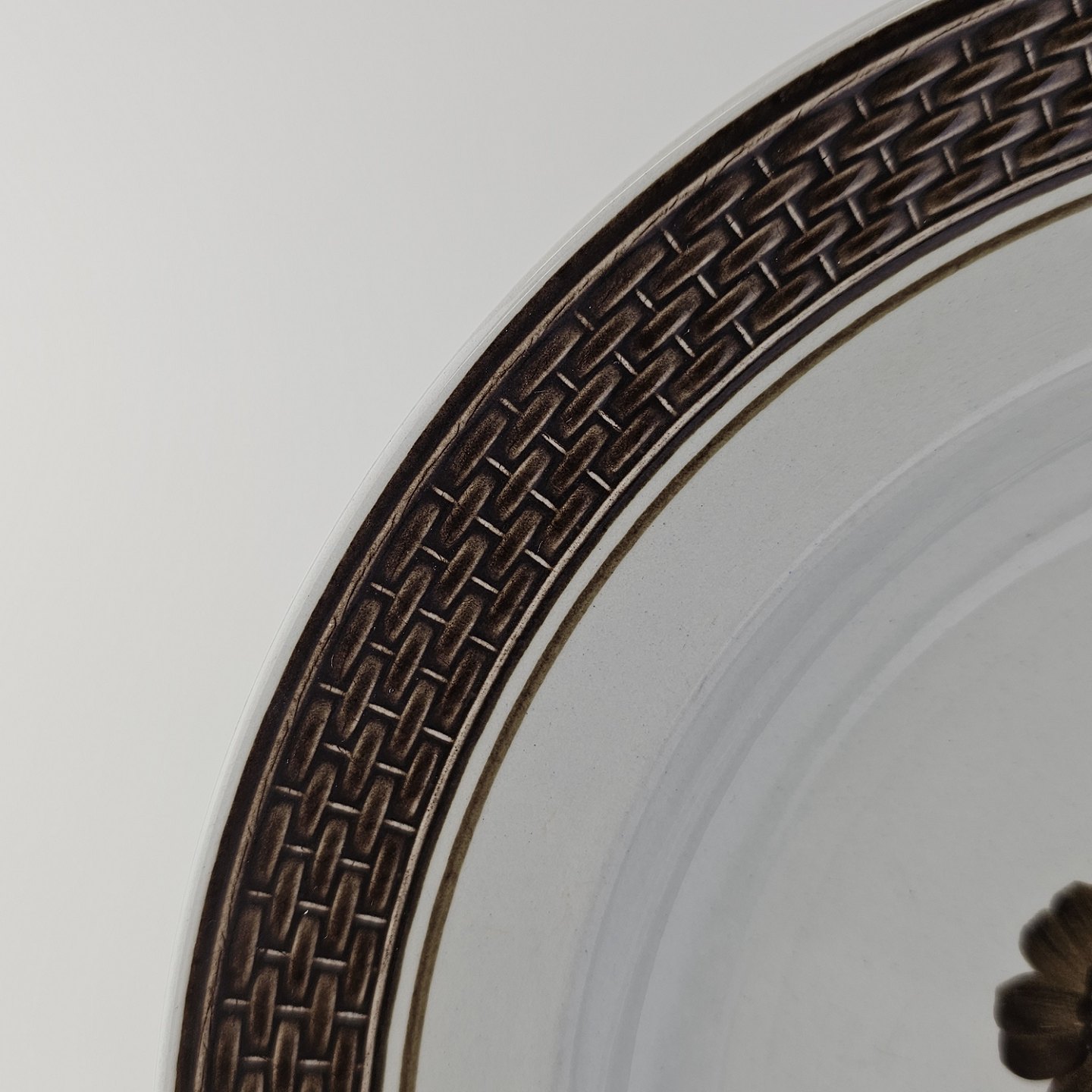 Fajancestellet med flettet kant og dekoration af brune blomster på lys baggrund med brun kant