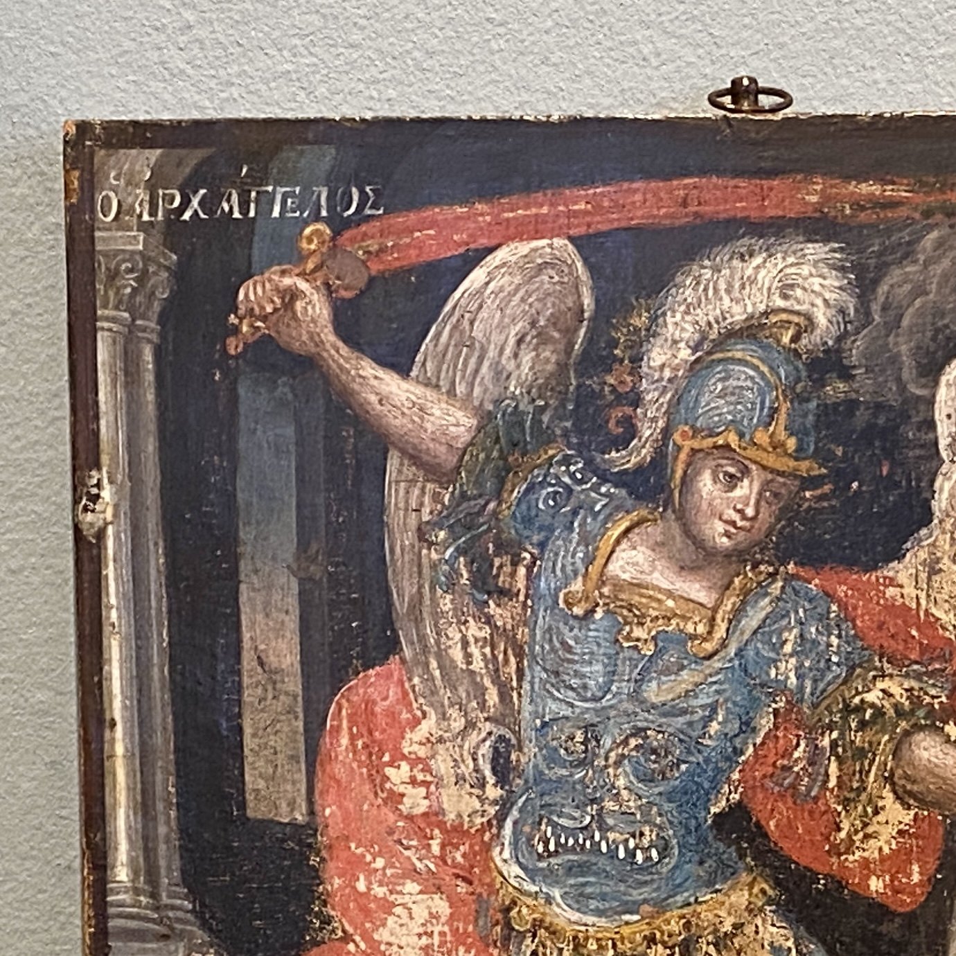 Greek Icon painted with the Archangel Michael defeating Satan. End of the 18th century. Dimensions: 32 x 24 cm. Thickness 1.5 cm.Item number: Ikon 1