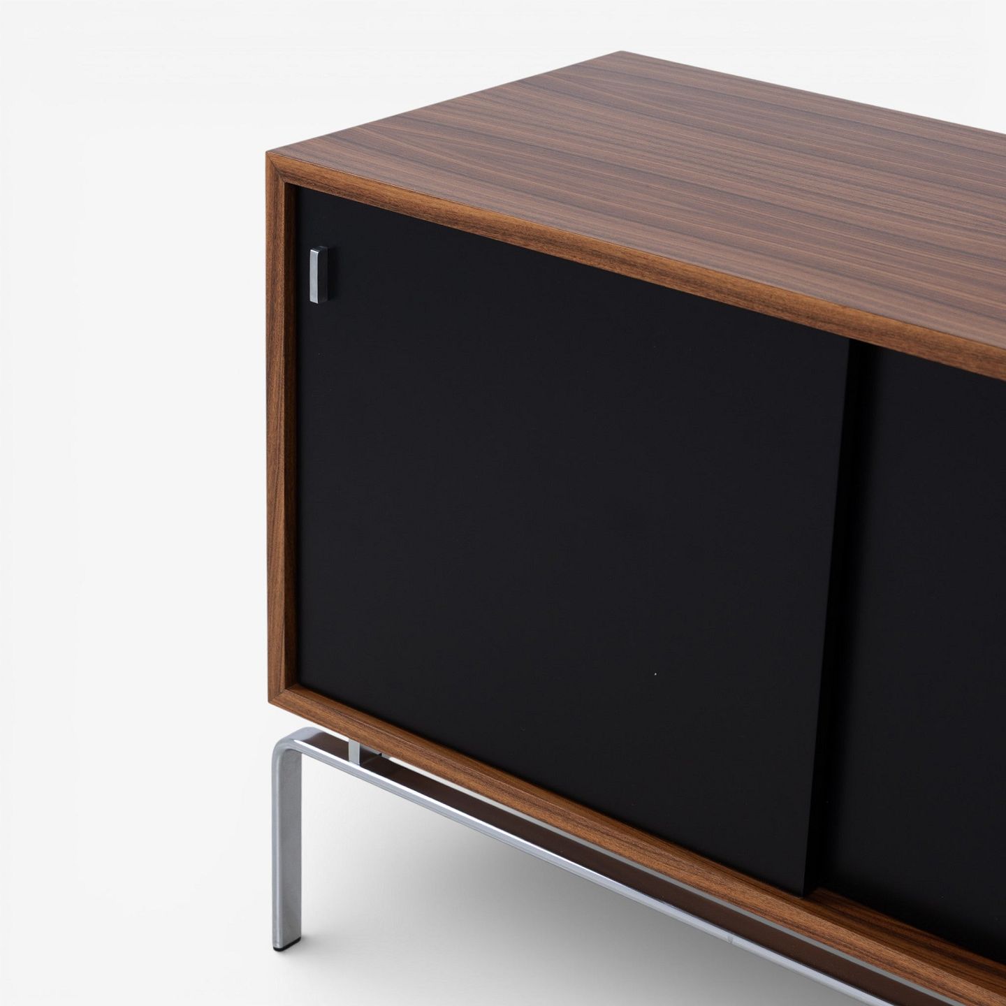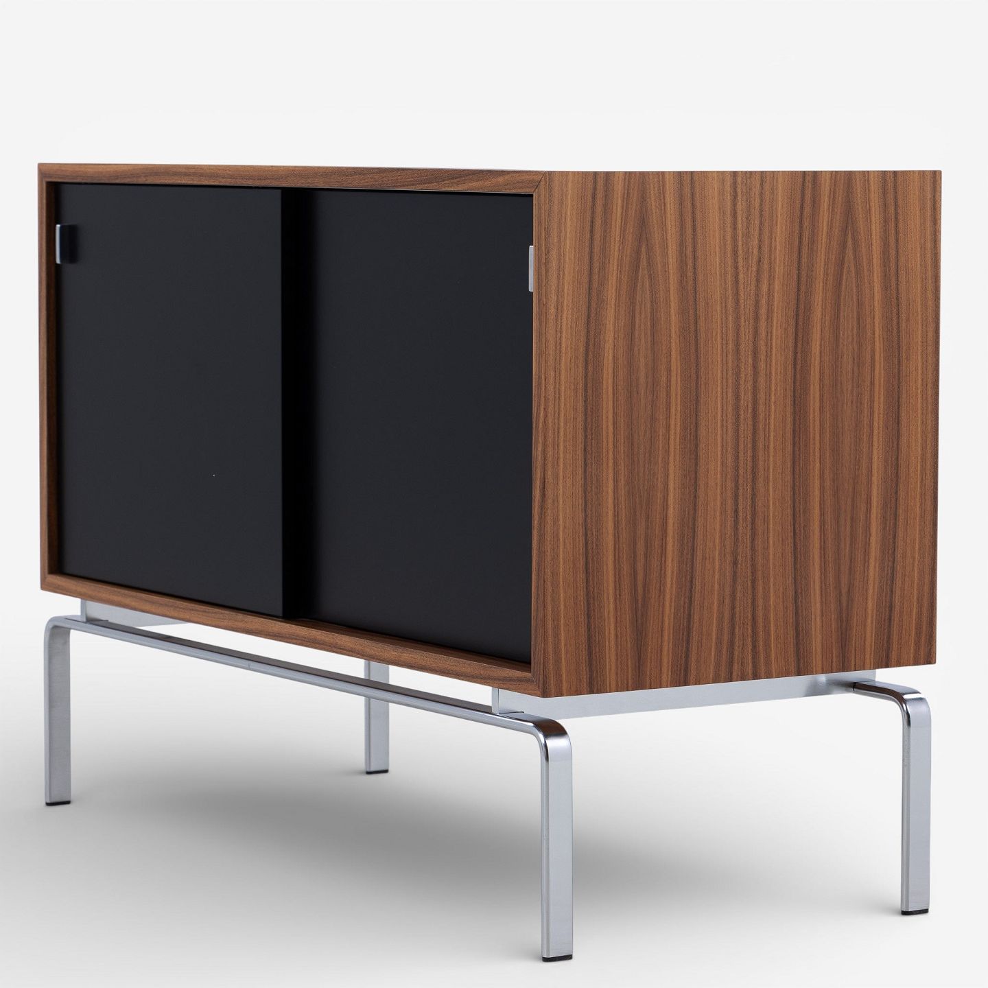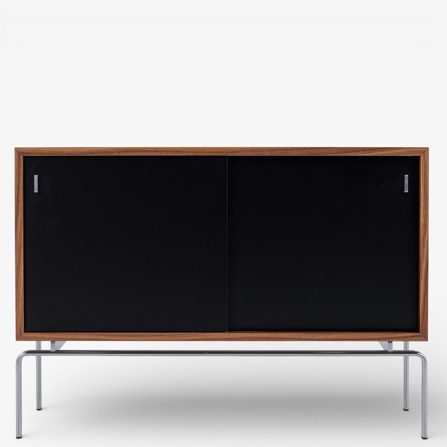 FK 100 - Sideboard in rosewood with black lacquered sliding doors and steel frame.