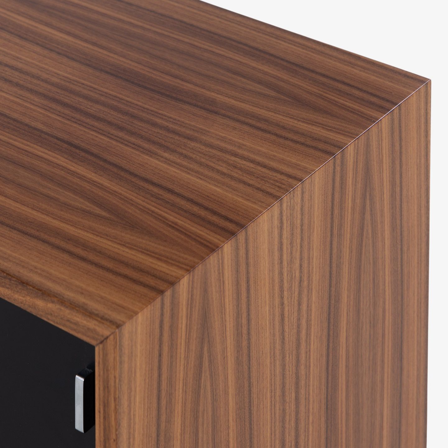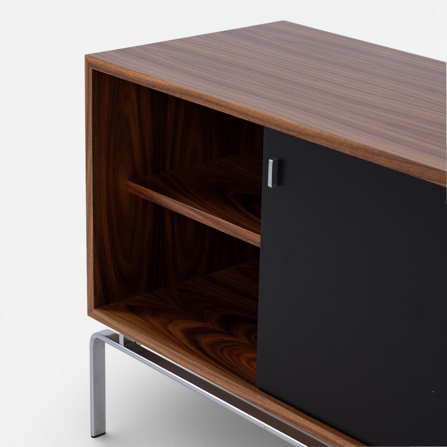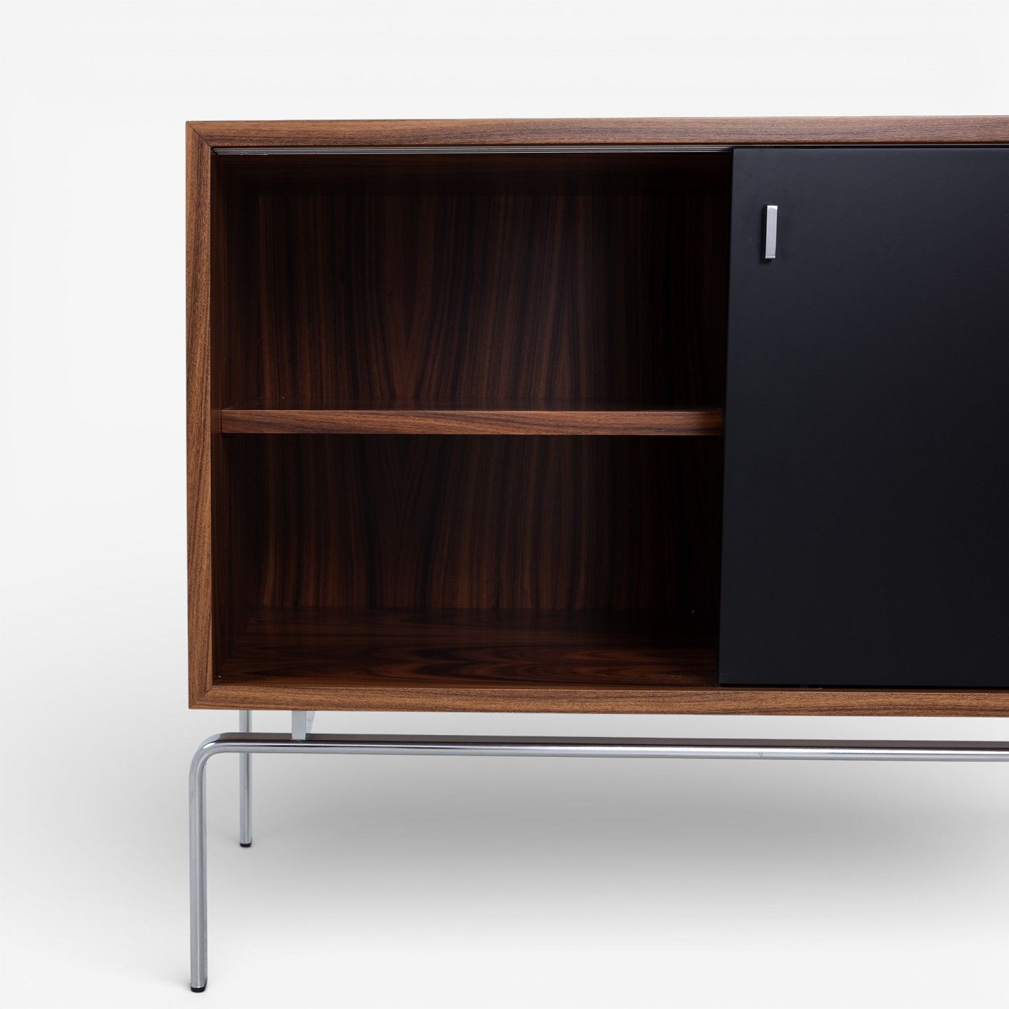 FK 100 - Sideboard in rosewood with black lacquered sliding doors and steel frame.