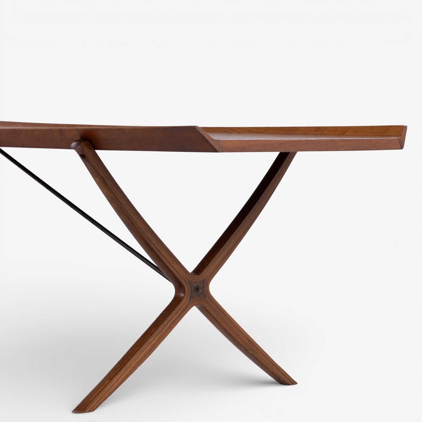 Rare 'X' coffee table with patinated teak top with fluted edge on cross frame. Manufacturer's stamp.