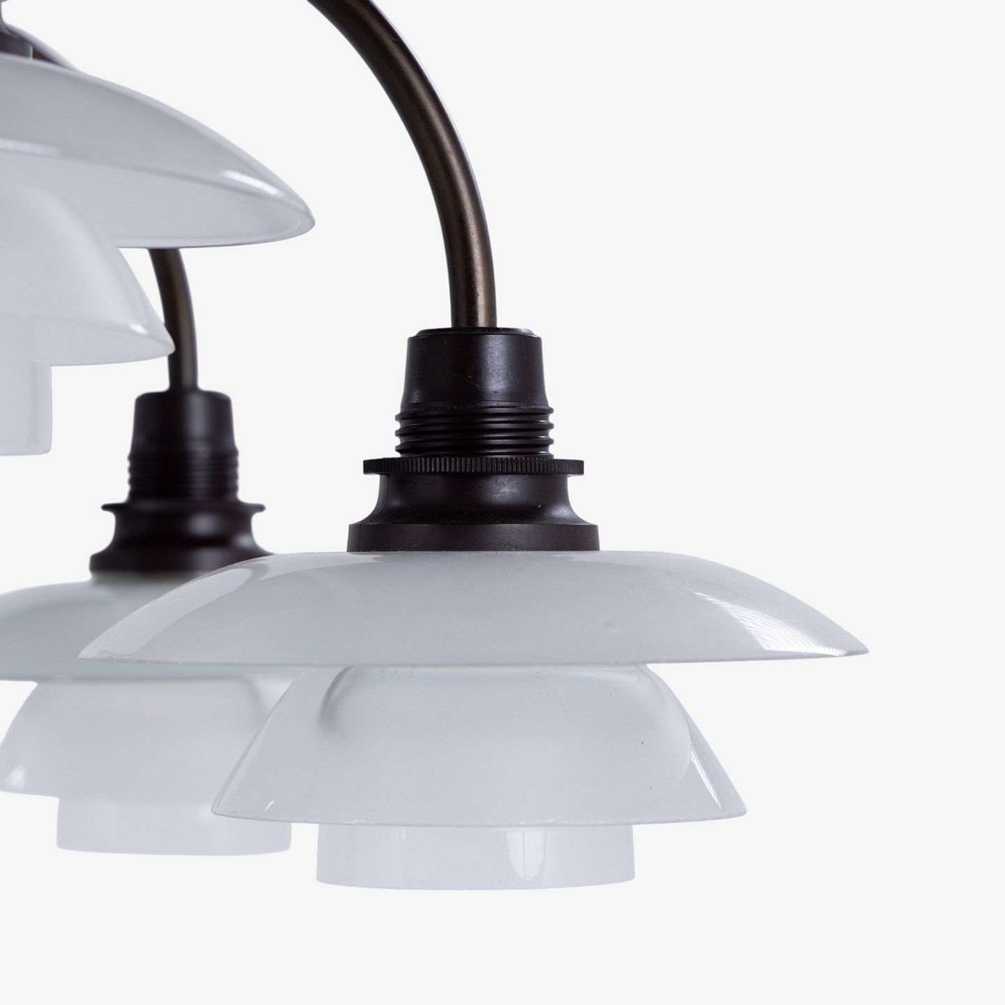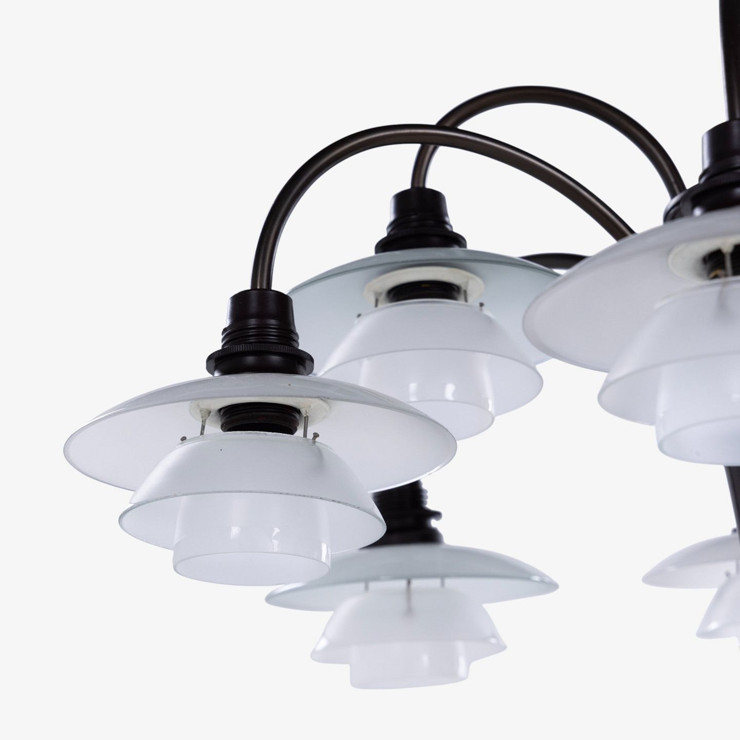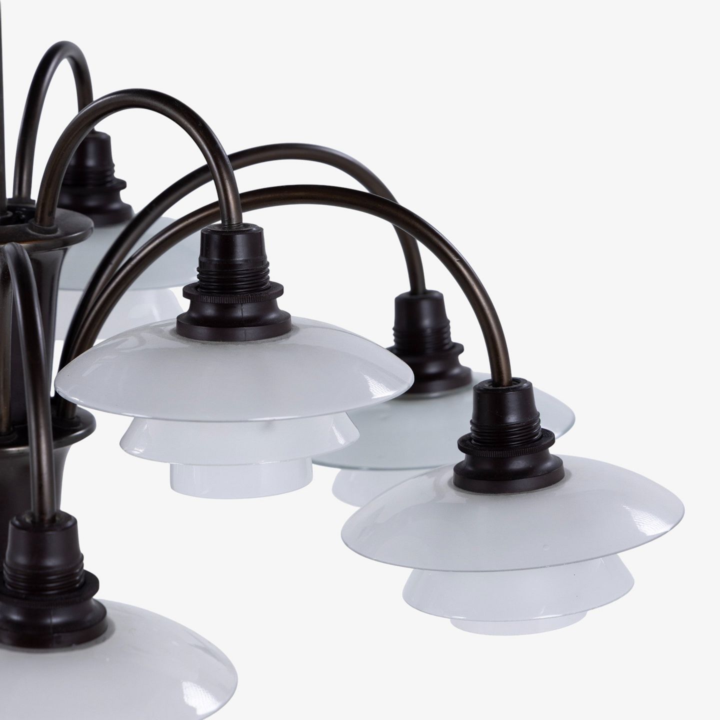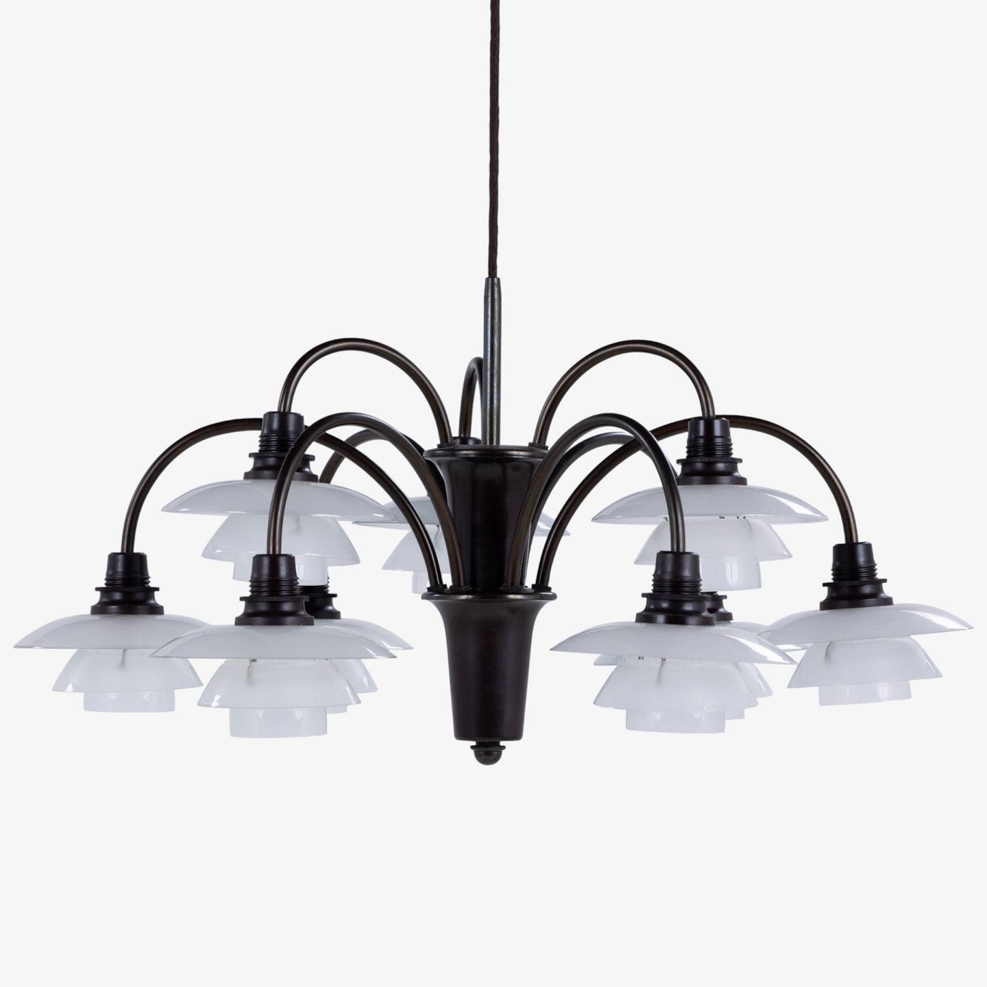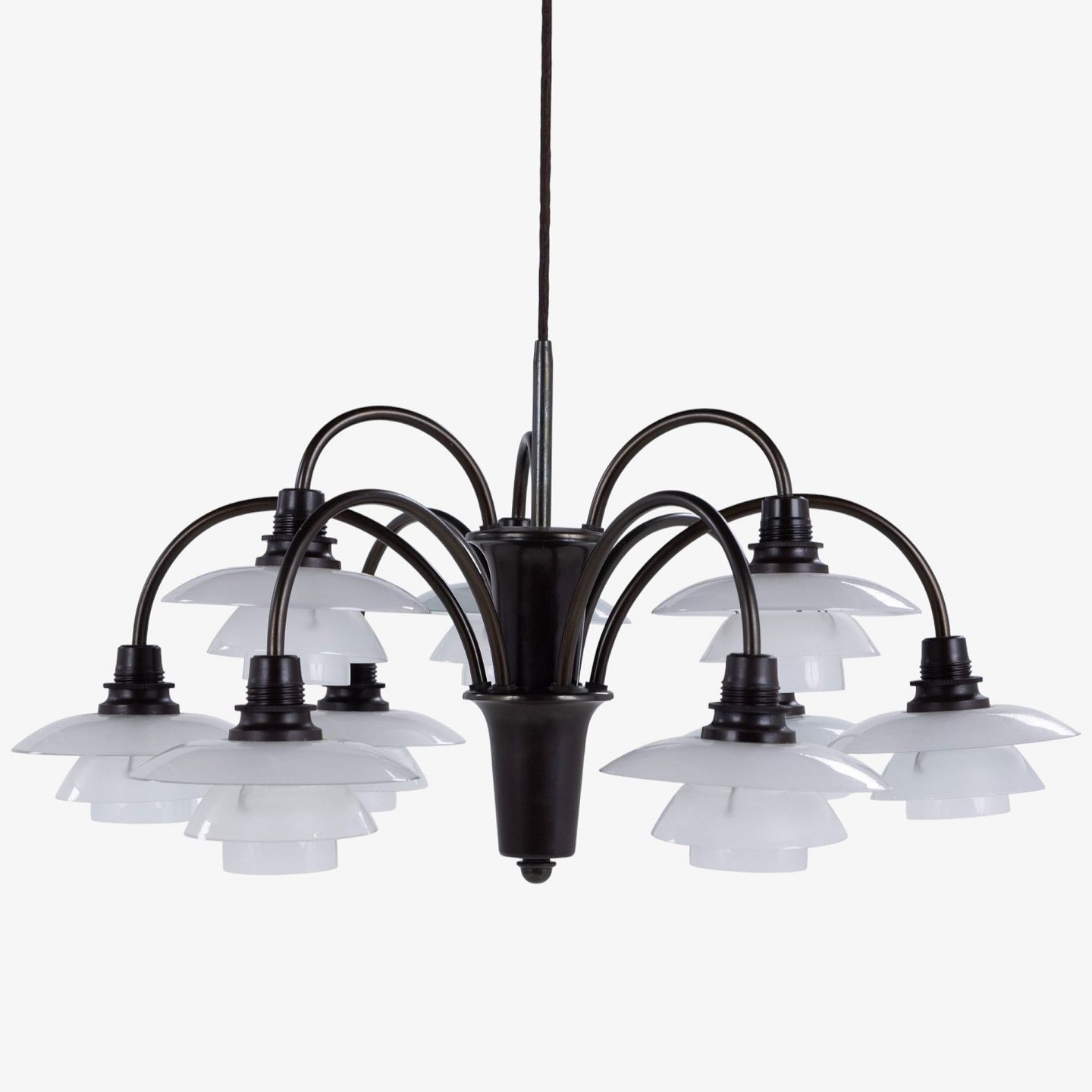PH 1/1 - 'Bombardement' chandelier with 9 arms in burnished brass and shades in frosted glass. Stamped 'Patented'.