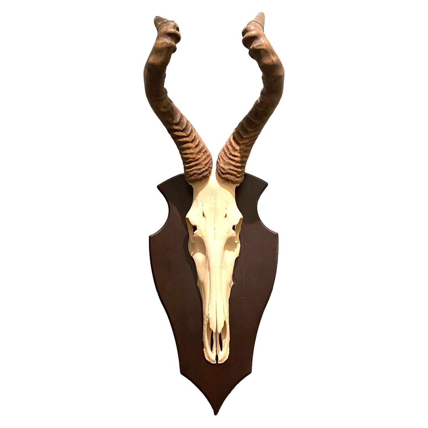 Hunting trophy of Hartebeest (red antelope) mounted on plate H. 90 cm.W. 30 cm.D. 30 cm.Item number: Jtf3