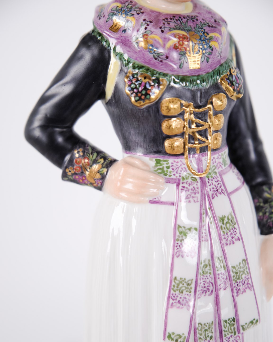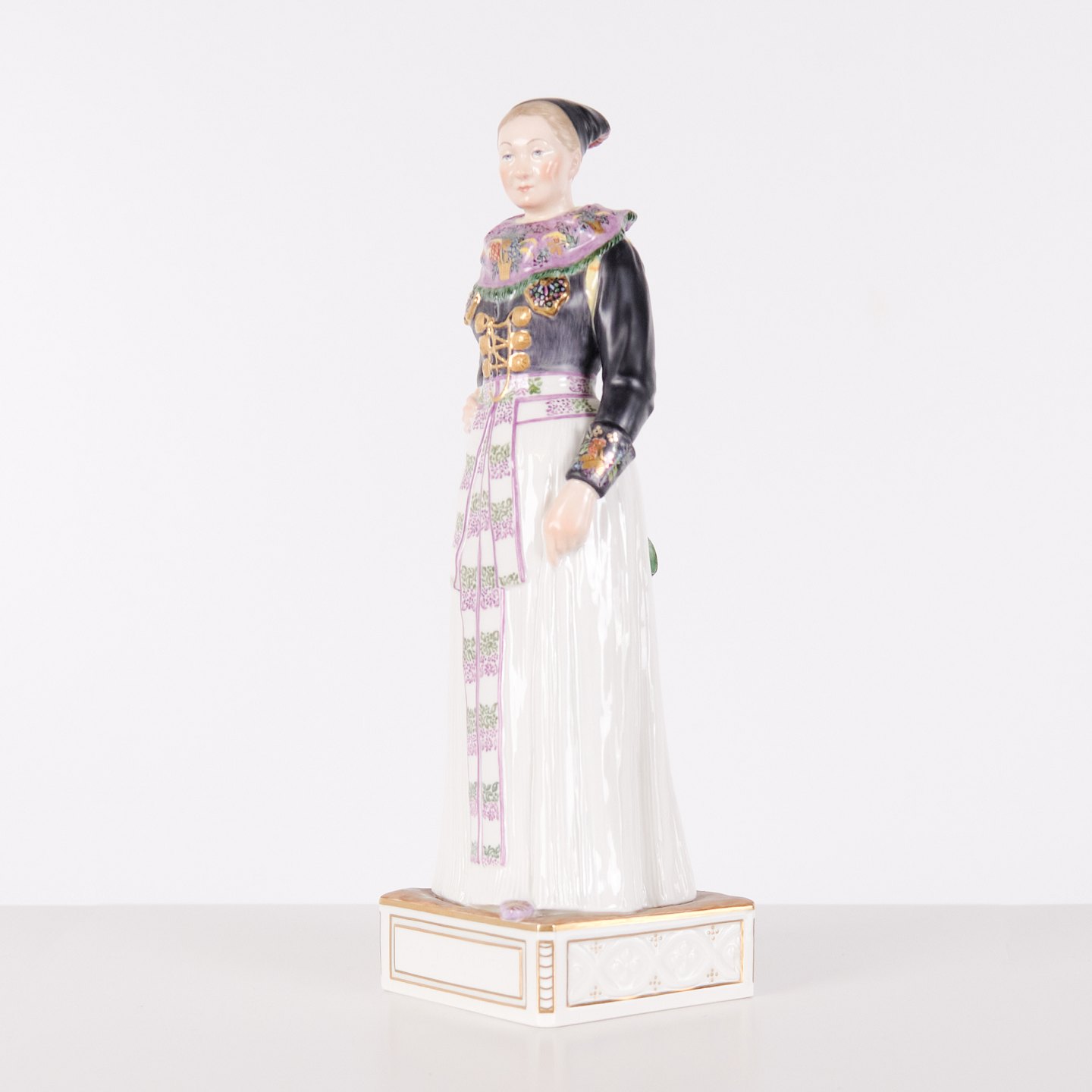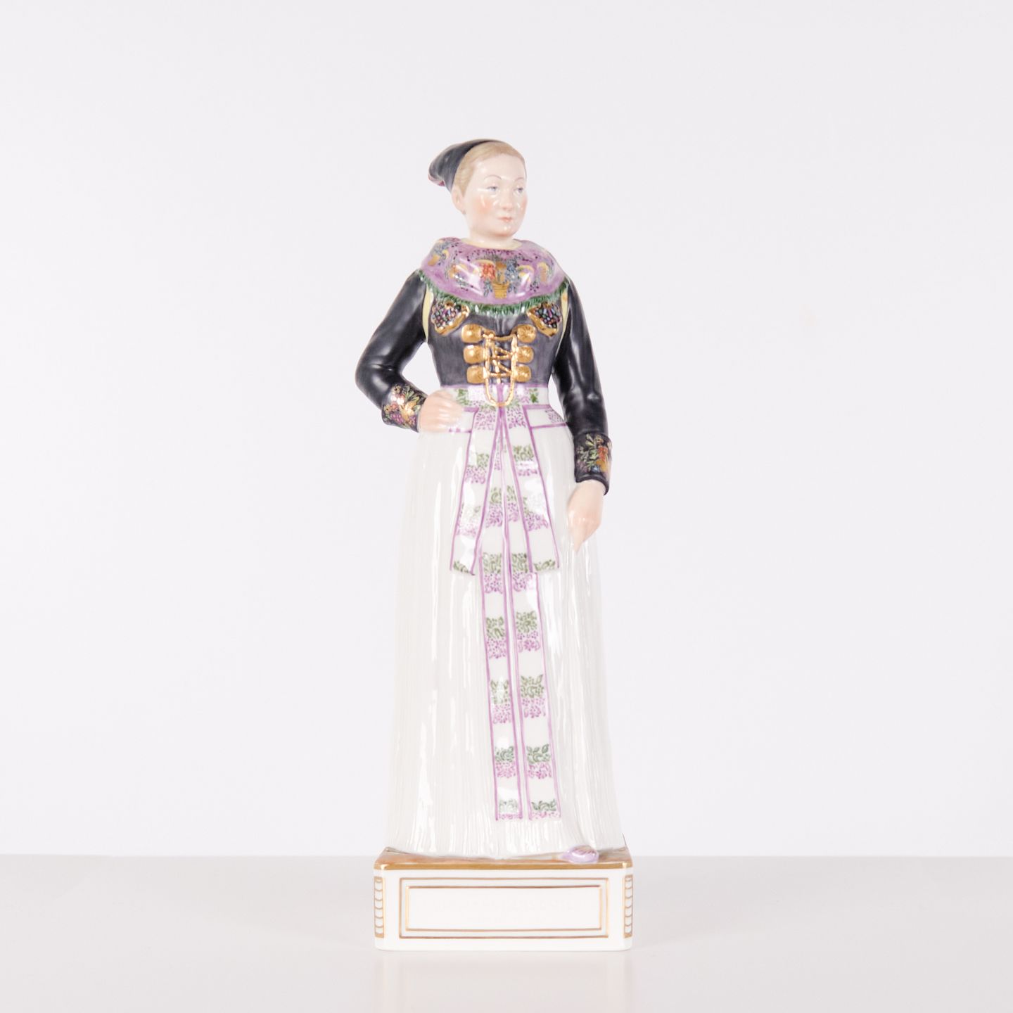 Overglaze porcelain figurine in Danish national dress, model 12104, depicting a cook’s costume from Amager. Designed by Carl Martin-Hansen (1877–1941) for Royal Copenhagen and part of the Danish National Costumes series.The series comprises a total of 47 figures and was produced between 1906 and 1925. Carl Martin-Hansen was recognised for his work with figures, busts and public monuments and belonged to the naturalistic tradition in Danish art around the turn of the century. The Danish national costume series is regarded as one of his most significant works for Royal Copenhagen and is known for its detailed and accurate representation of regional dress.