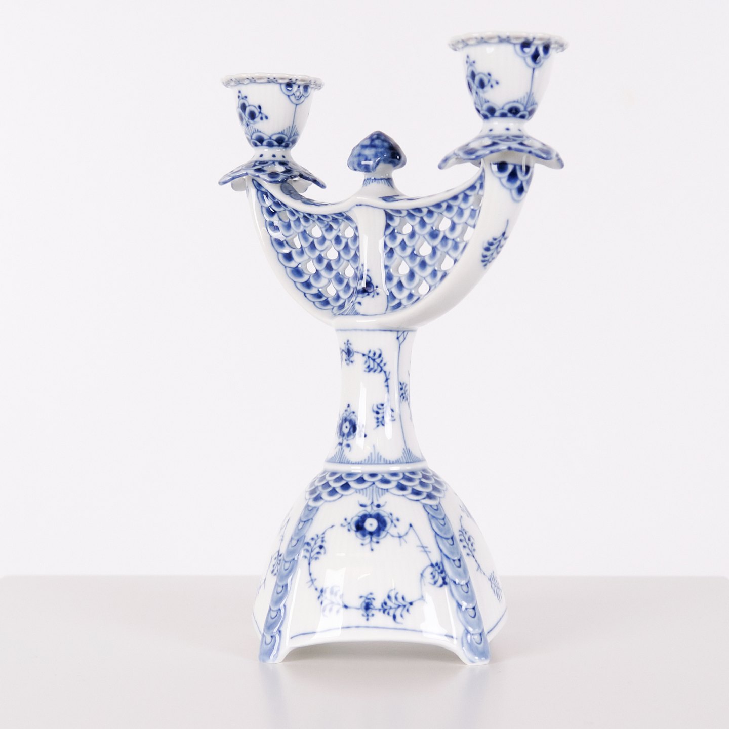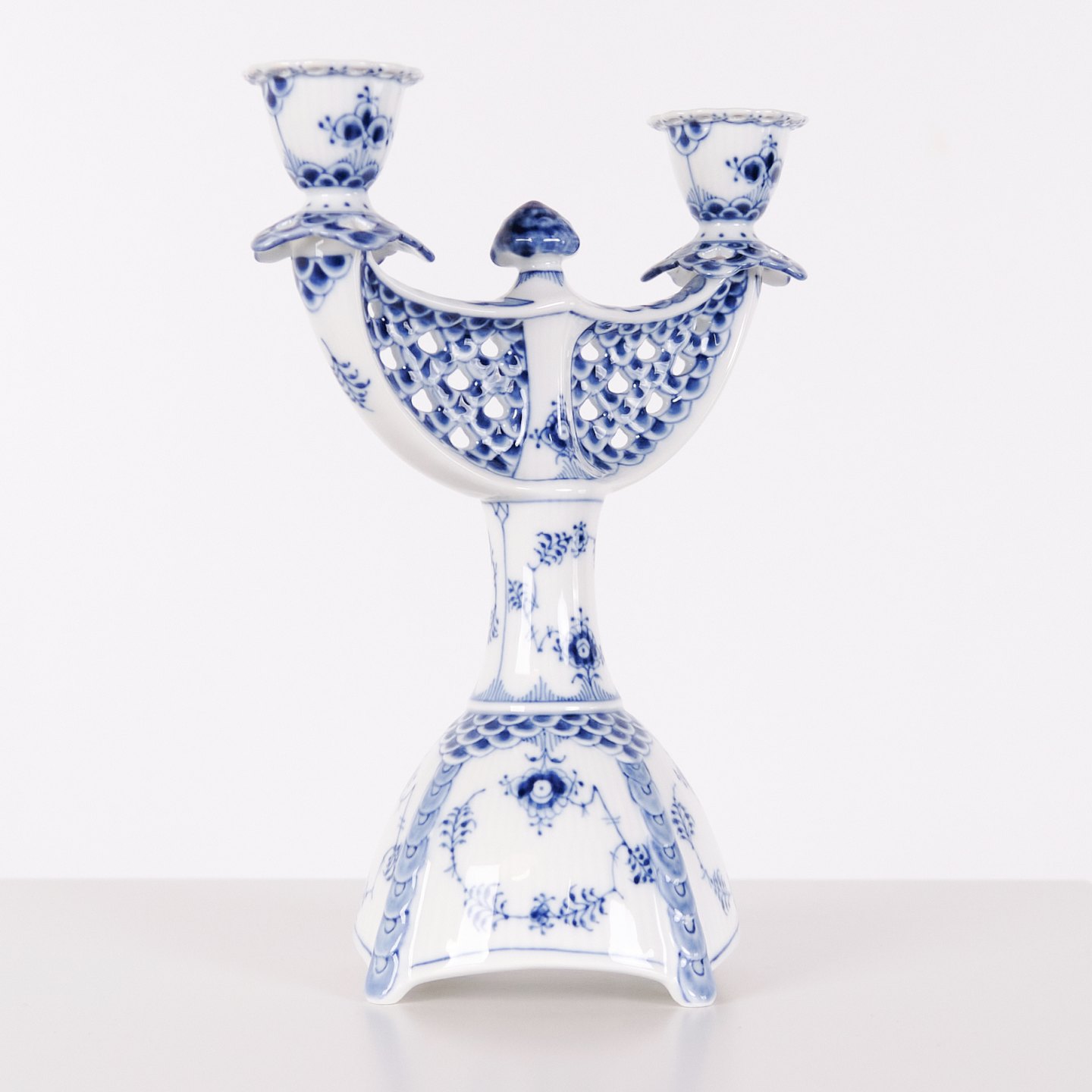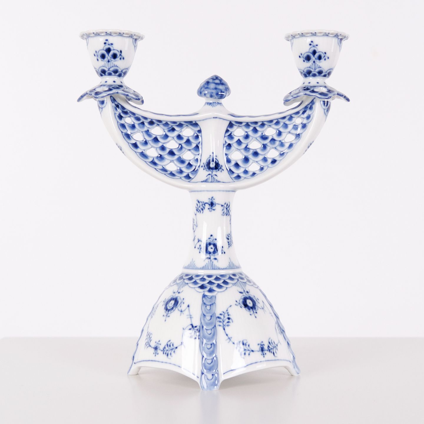 Two-arm candlestick in Blue Fluted Full Lace porcelain, model 1169, produced by Royal Copenhagen. Executed in hand-painted porcelain with the characteristic openwork lace border and underglaze decoration. Produced as first quality and part of Royal Copenhagen’s traditional tableware production.— Manufacturer: Royal Copenhagen