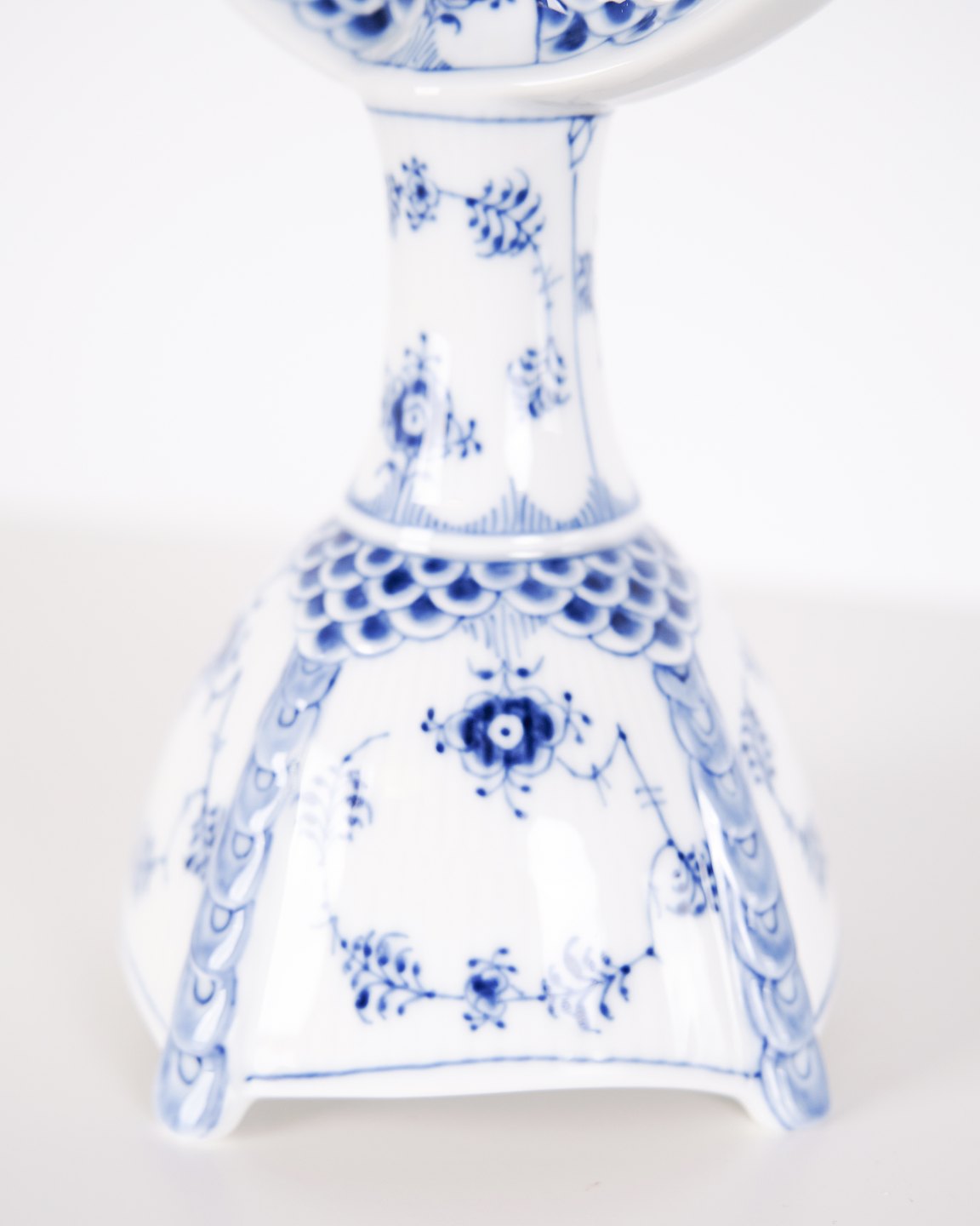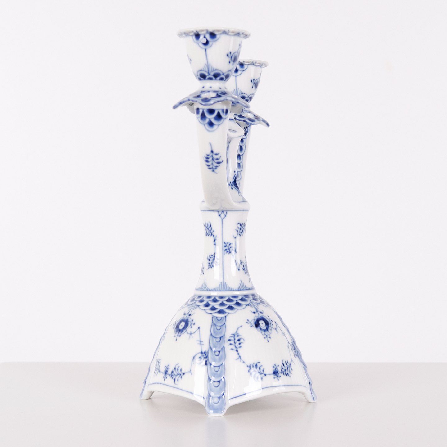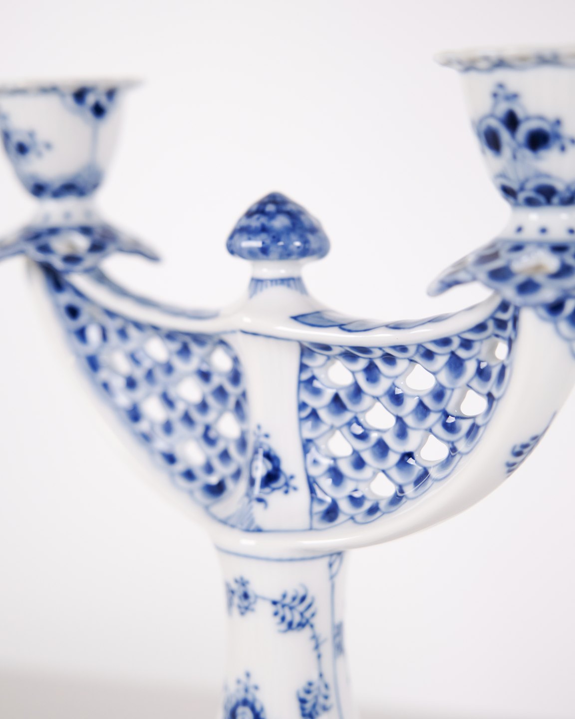 Two-arm candlestick in Blue Fluted Full Lace porcelain, model 1169, produced by Royal Copenhagen. Executed in hand-painted porcelain with the characteristic openwork lace border and underglaze decoration. Produced as first quality and part of Royal Copenhagen’s traditional tableware production.— Manufacturer: Royal Copenhagen