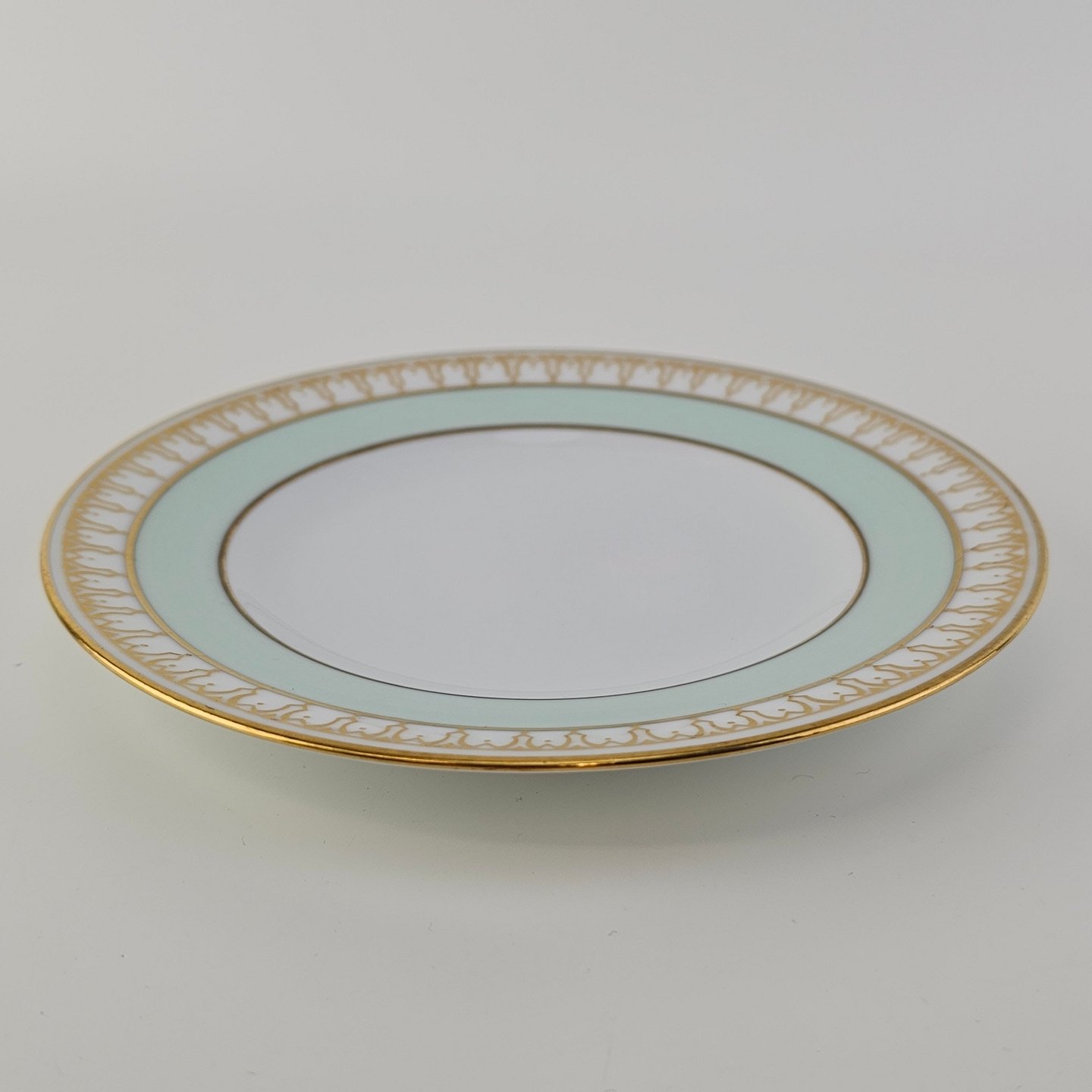 Thorvaldsen er stel i glat hvidt porcelæn med lysegrøn bort, forgyldt dekoration og guldkant