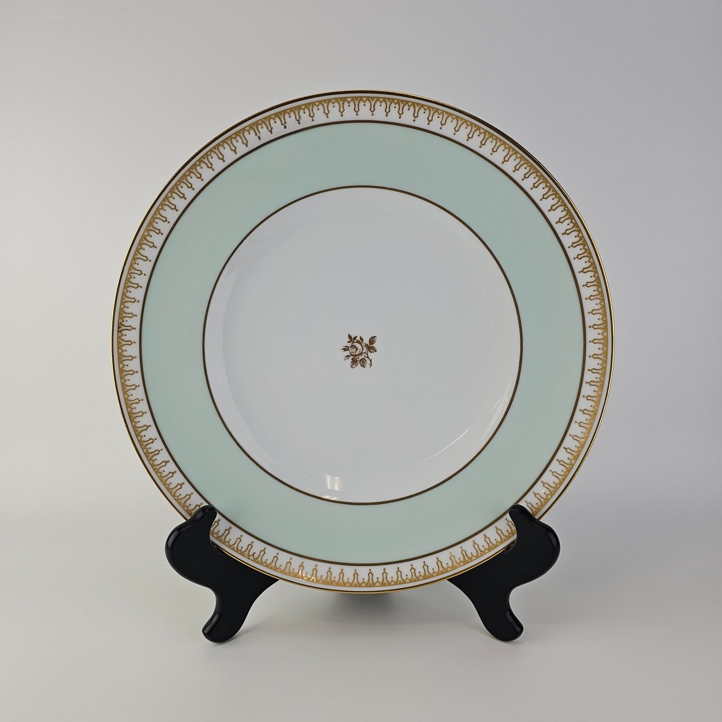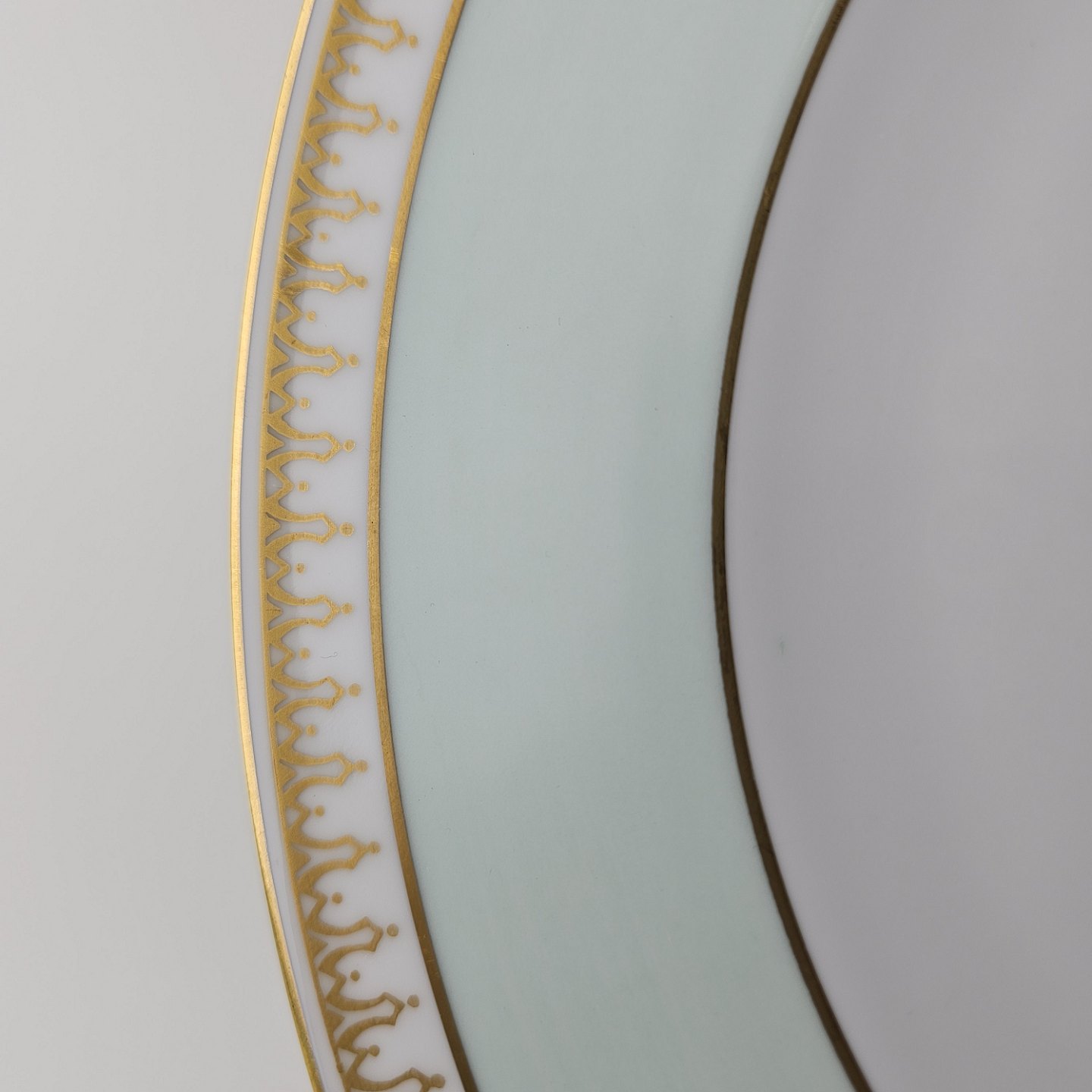 Thorvaldsen er stel i glat hvidt porcelæn med lysegrøn bort, forgyldt dekoration og guldkant