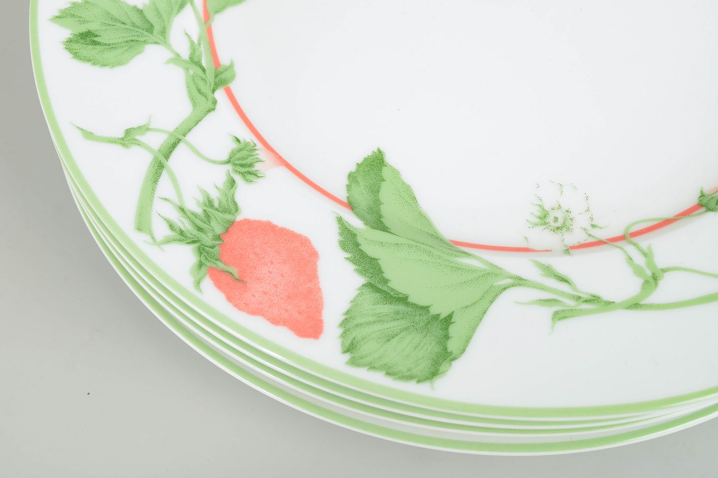 Limoges porcelain is renowned for its fine quality and long tradition of decorated tableware. During the 1980s, fruit and botanical motifs became popular as a fresh and decorative element for contemporary table settings. The Fraise series is characteristic of the period, with its naturalistic strawberry motif and coloured rims creating a light and classic appearance.