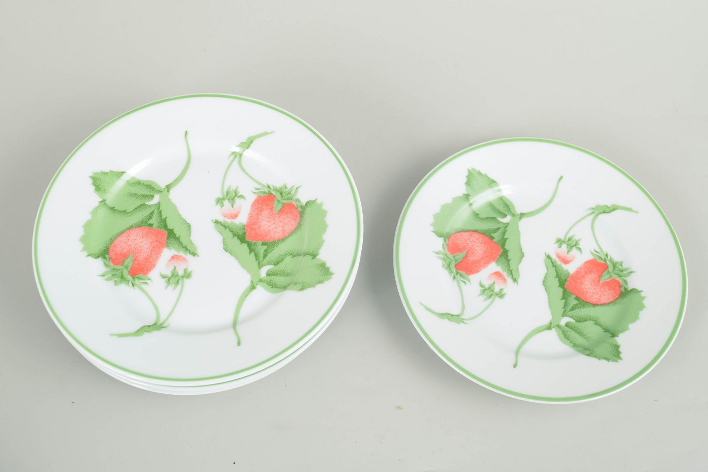 Limoges porcelain is renowned for its fine quality and long tradition of decorated tableware. During the 1980s, fruit and floral motifs became popular for their light and decorative character in everyday and serving pieces. The Fraise series is characteristic of this taste, with its naturalistic motif and simple green rim.