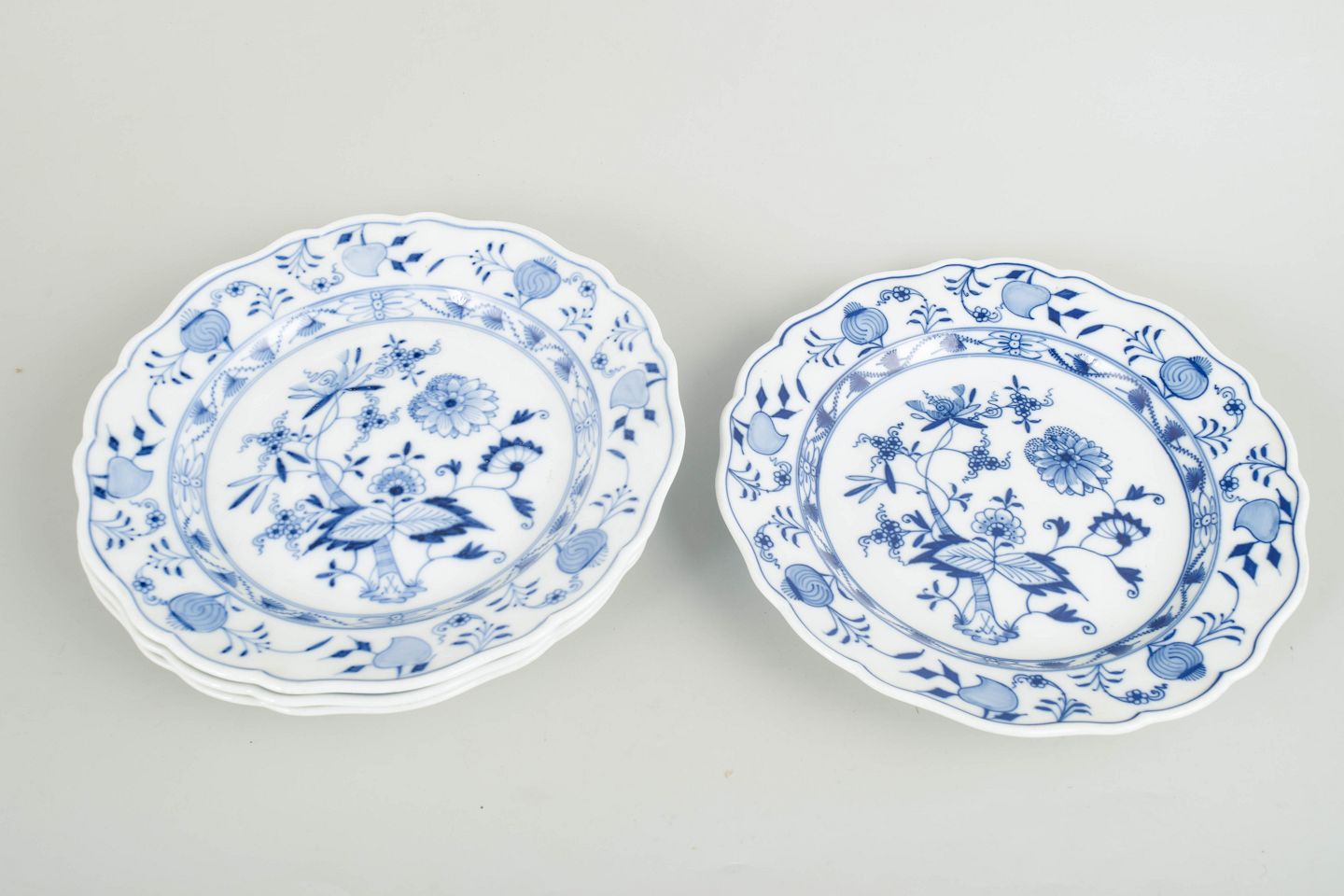 Meissen, set of 4 deep plates, Blue Onion pattern.Set of four deep porcelain plates with blue underglaze decoration in the classic Blue Onion pattern.