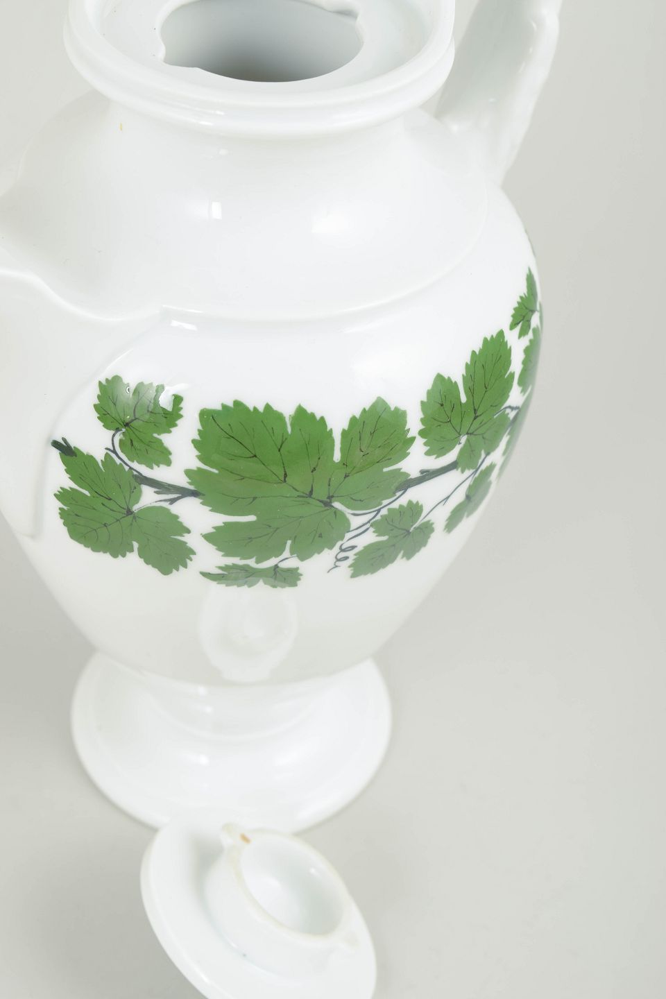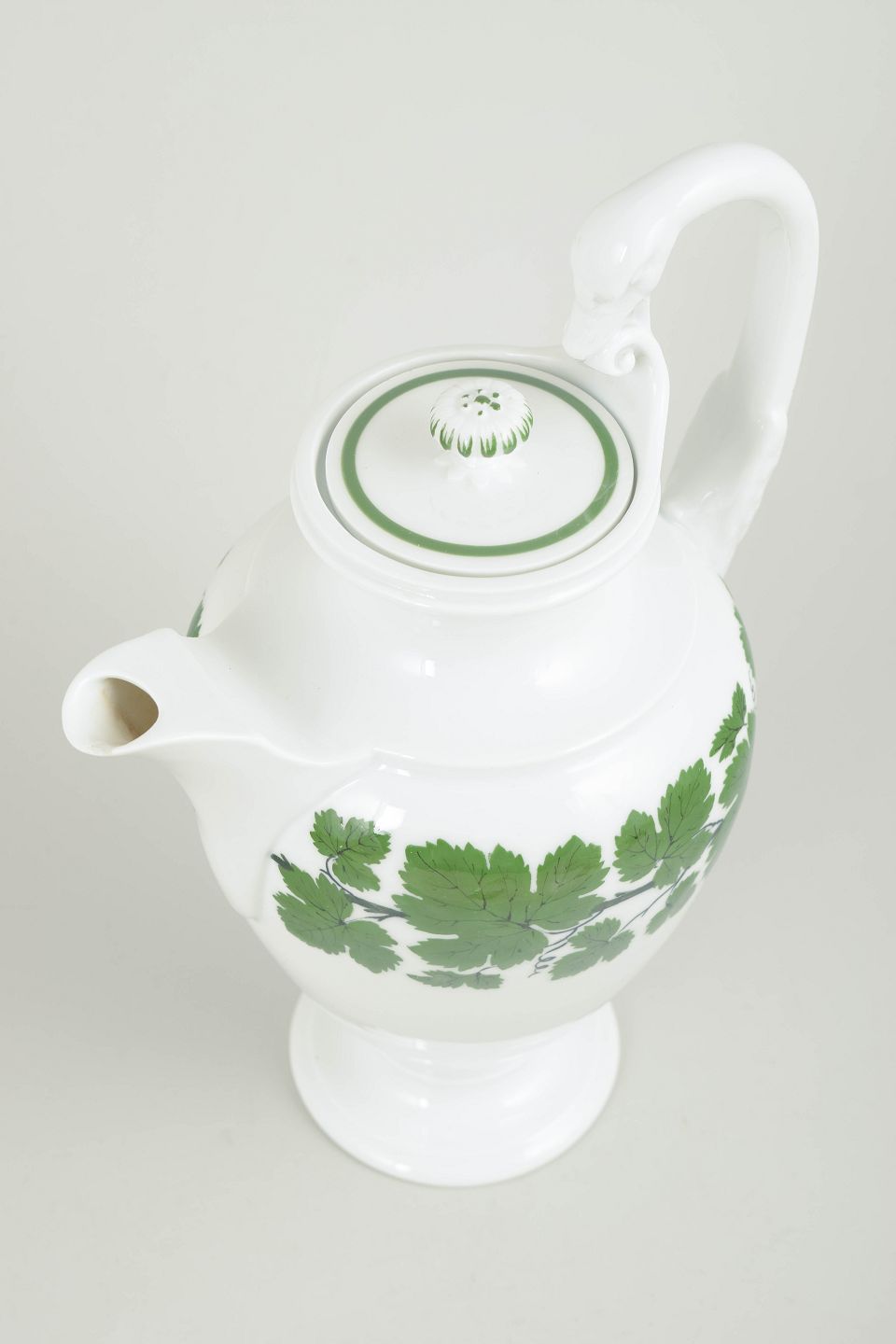 Meissen, chocolate pot from the green vine leaf series.Porcelain chocolate pot with a green vine and vine-leaf decoration around the body; from the green vine leaf series.