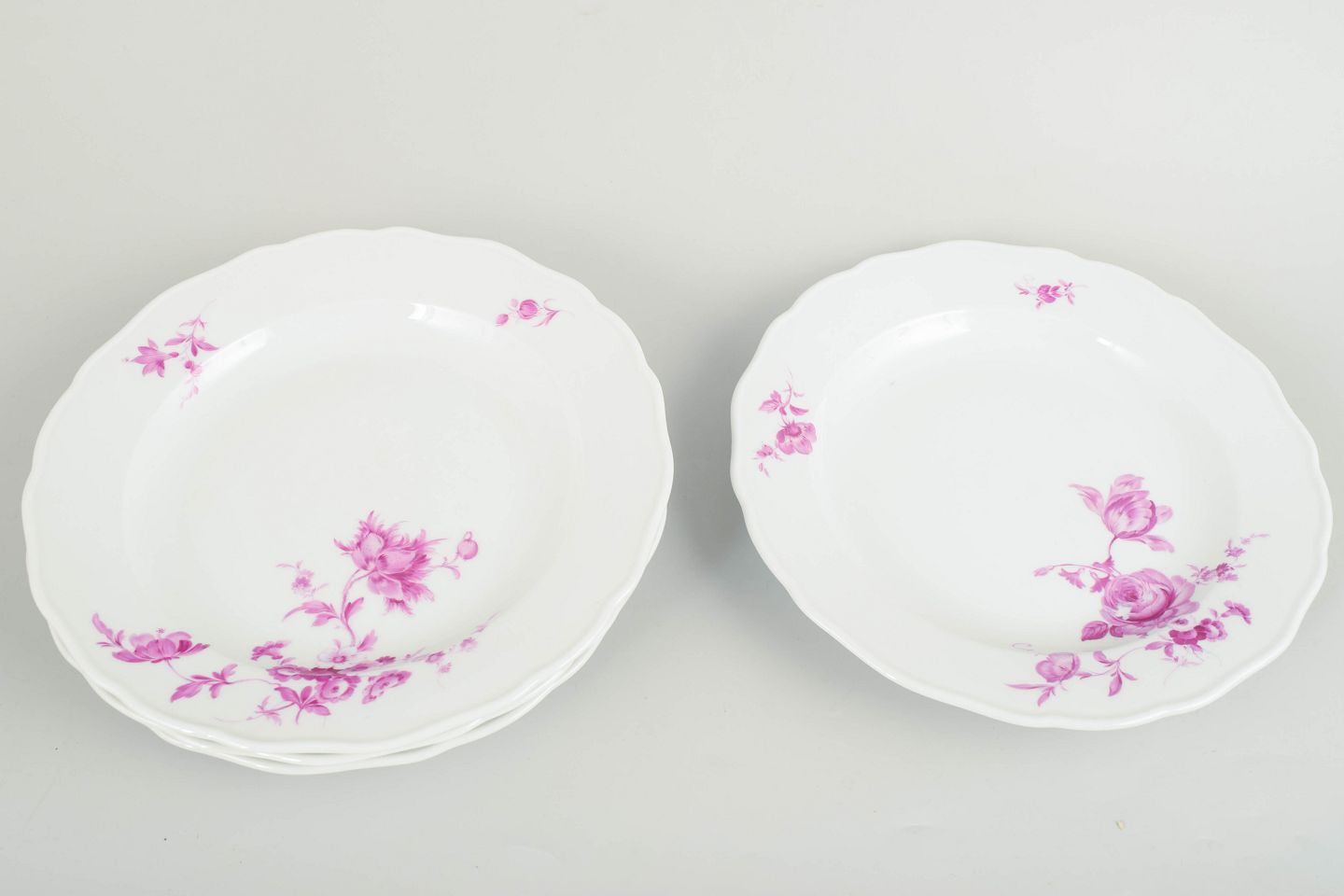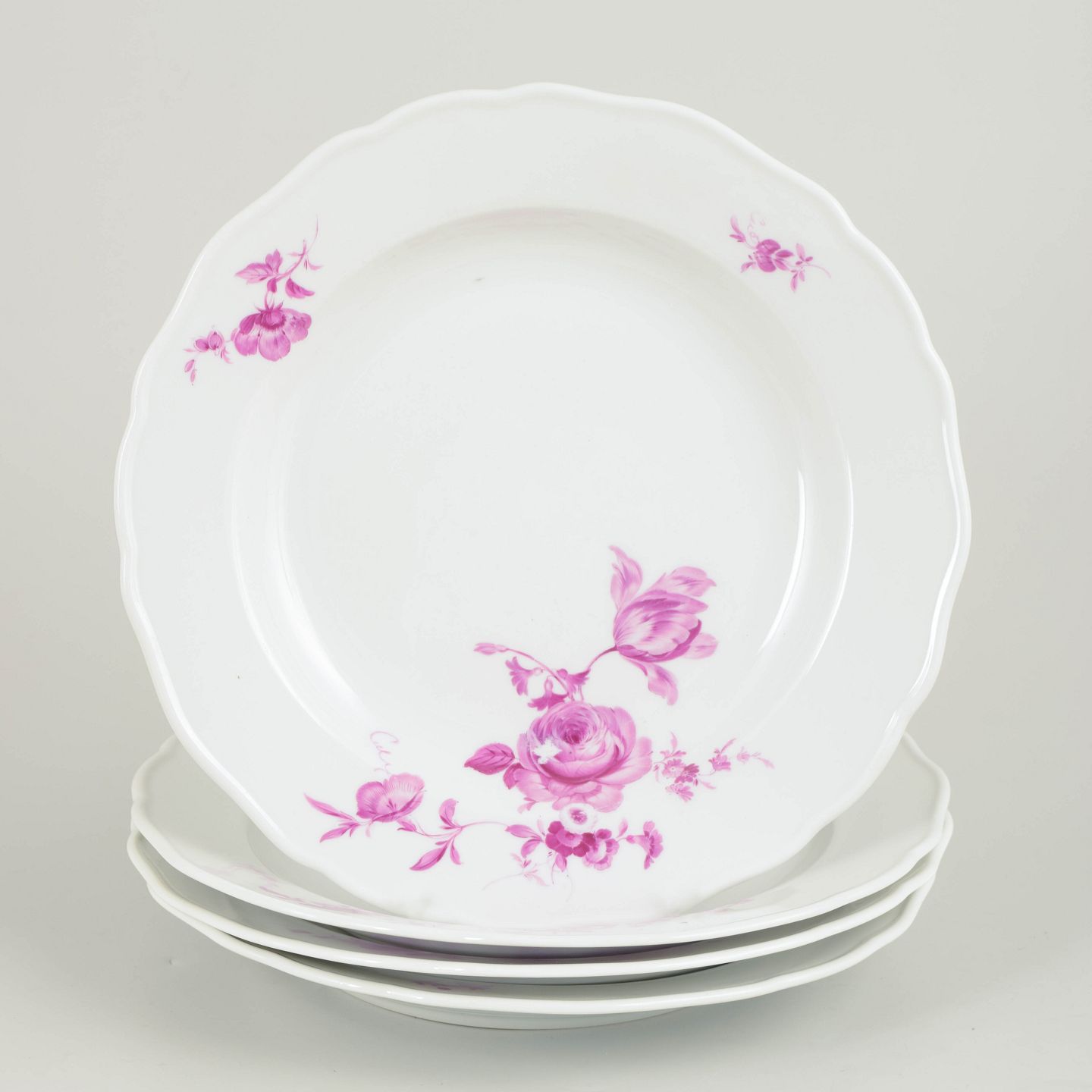 Meissen, set of four dinner plates.Set of four white-glazed porcelain plates decorated with hand-painted floral motifs in pink tones.