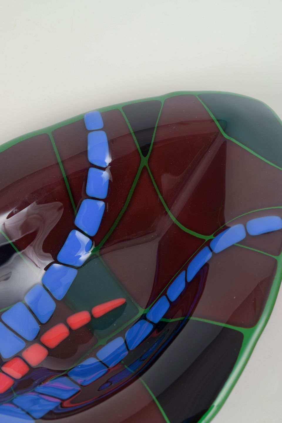 Matz Borgström, unique glass sculpture. Approx. 1980s.Organic-shaped piece of art glass with a geometric, mosaic-like composition in deep tones; made as a unique work and numbered. The reverse shows a handwritten signature and the notation “Unique no. 74”.