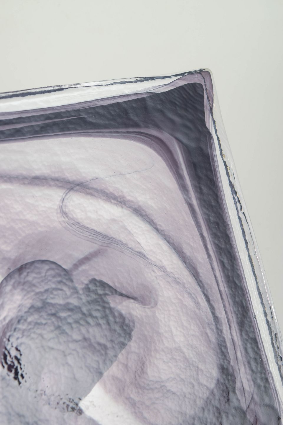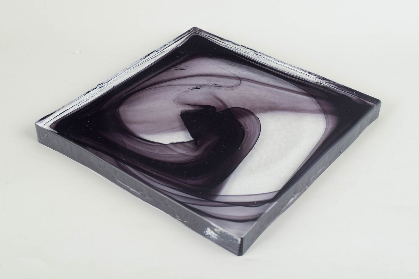 Kosta Boda, Cirrus Black, art glass object.Flat, square object in clear glass with embedded swirling black and grey glass threads forming an abstract cirrus-like pattern. The model is known as Cirrus Black.