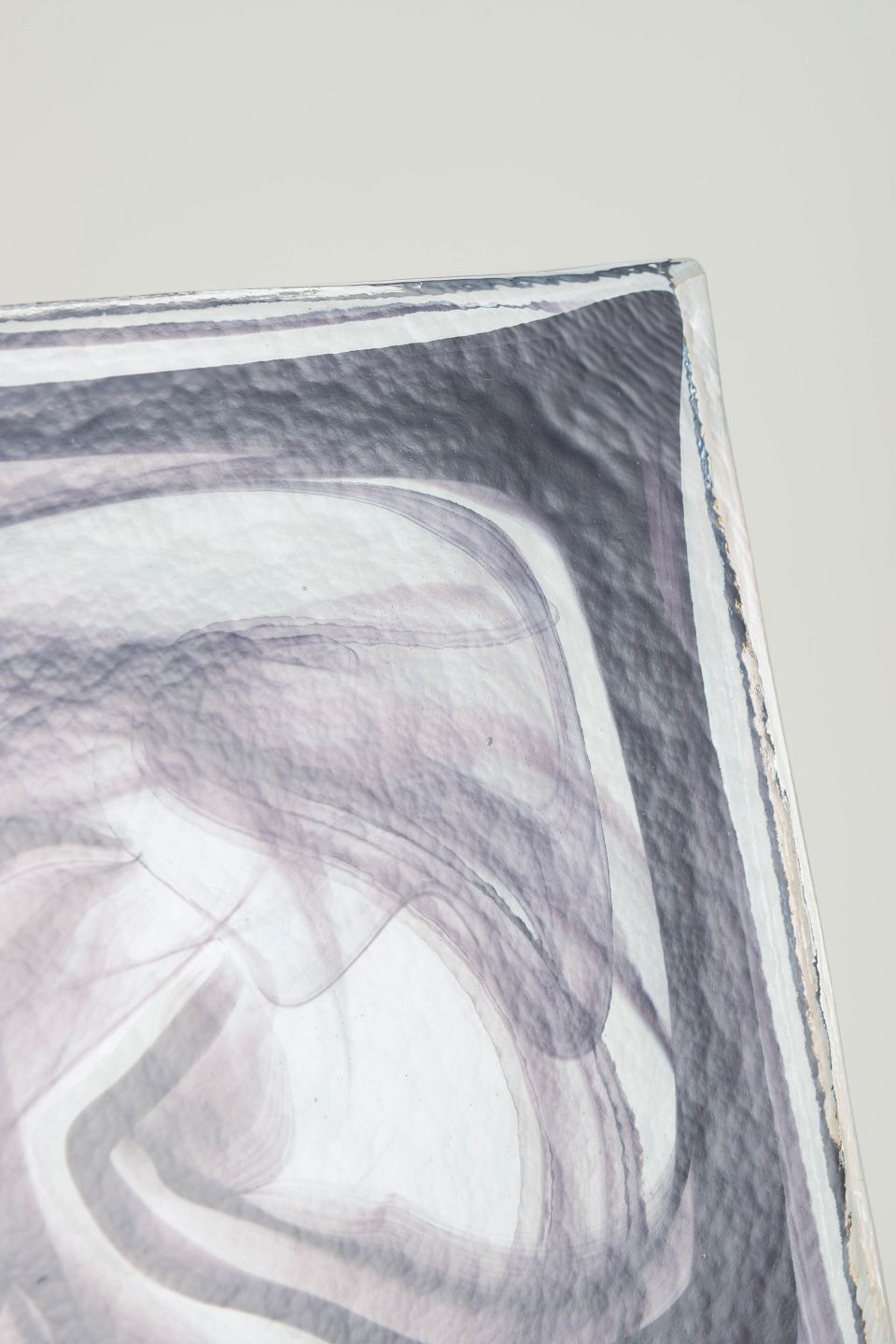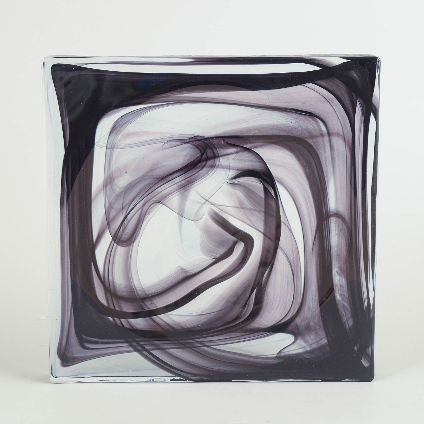 Kosta Boda, Cirrus Black, art glass object.Flat, square object in clear glass with embedded swirling black and grey glass threads forming an abstract cirrus-like pattern. The model is known as Cirrus Black.