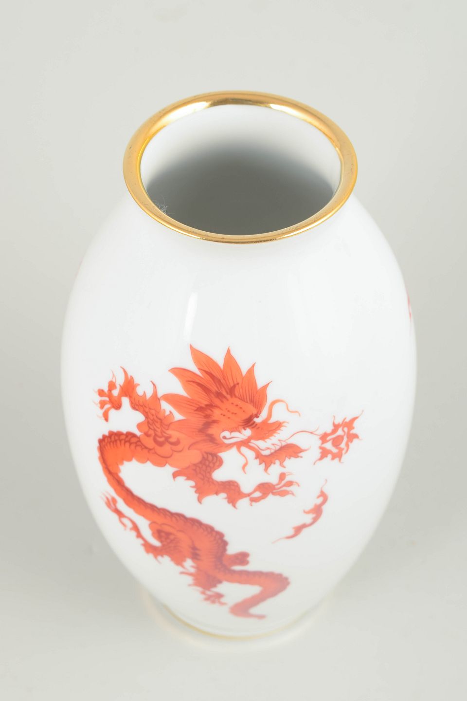 Vase with Ming dragon, Meissen area.Baluster-shaped vase in white-glazed porcelain decorated with a red Ming dragon and a gilt rim. The model was produced in the Meissen area and is not made by the Royal Meissen manufactory.