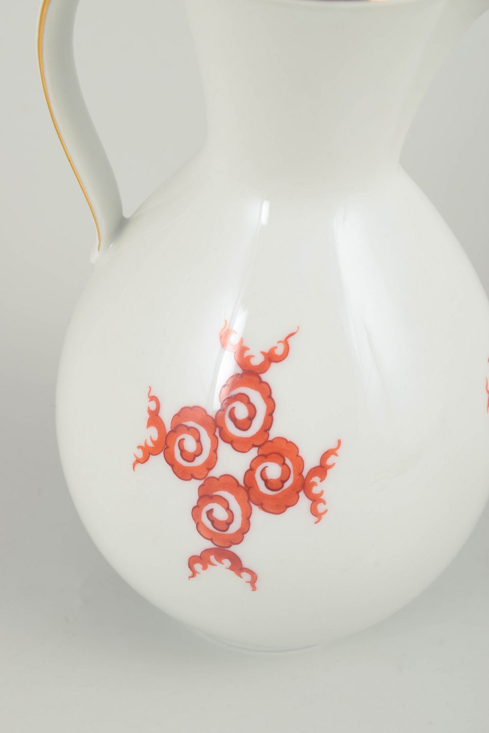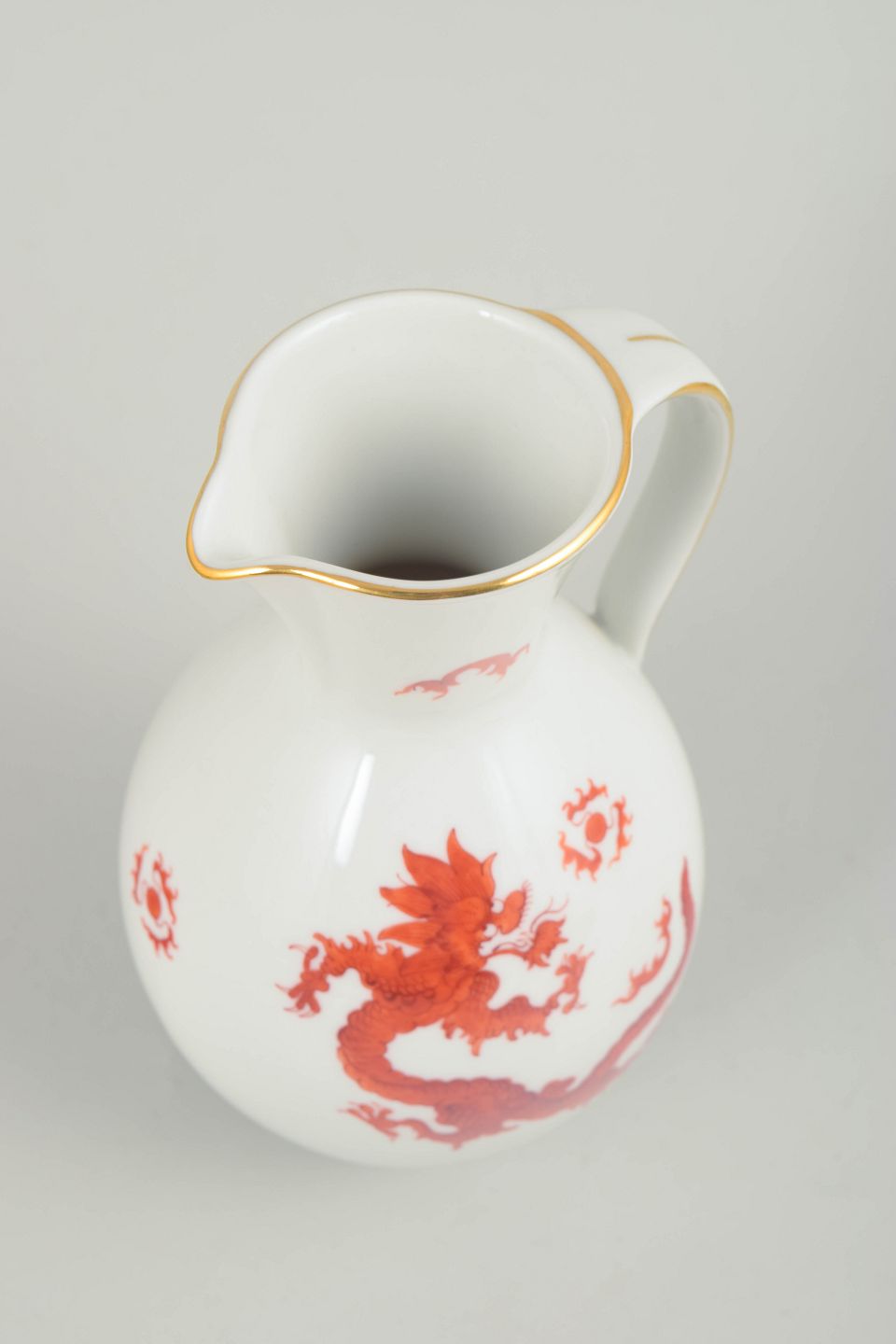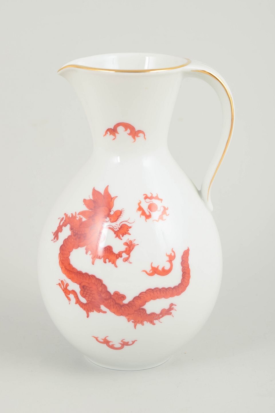 Jug with Ming dragon, Meissen area.Baluster-shaped jug in white-glazed porcelain decorated with a red Ming dragon and a gilt rim. The model was produced in the Meissen area and is not made by the Royal Meissen manufactory.