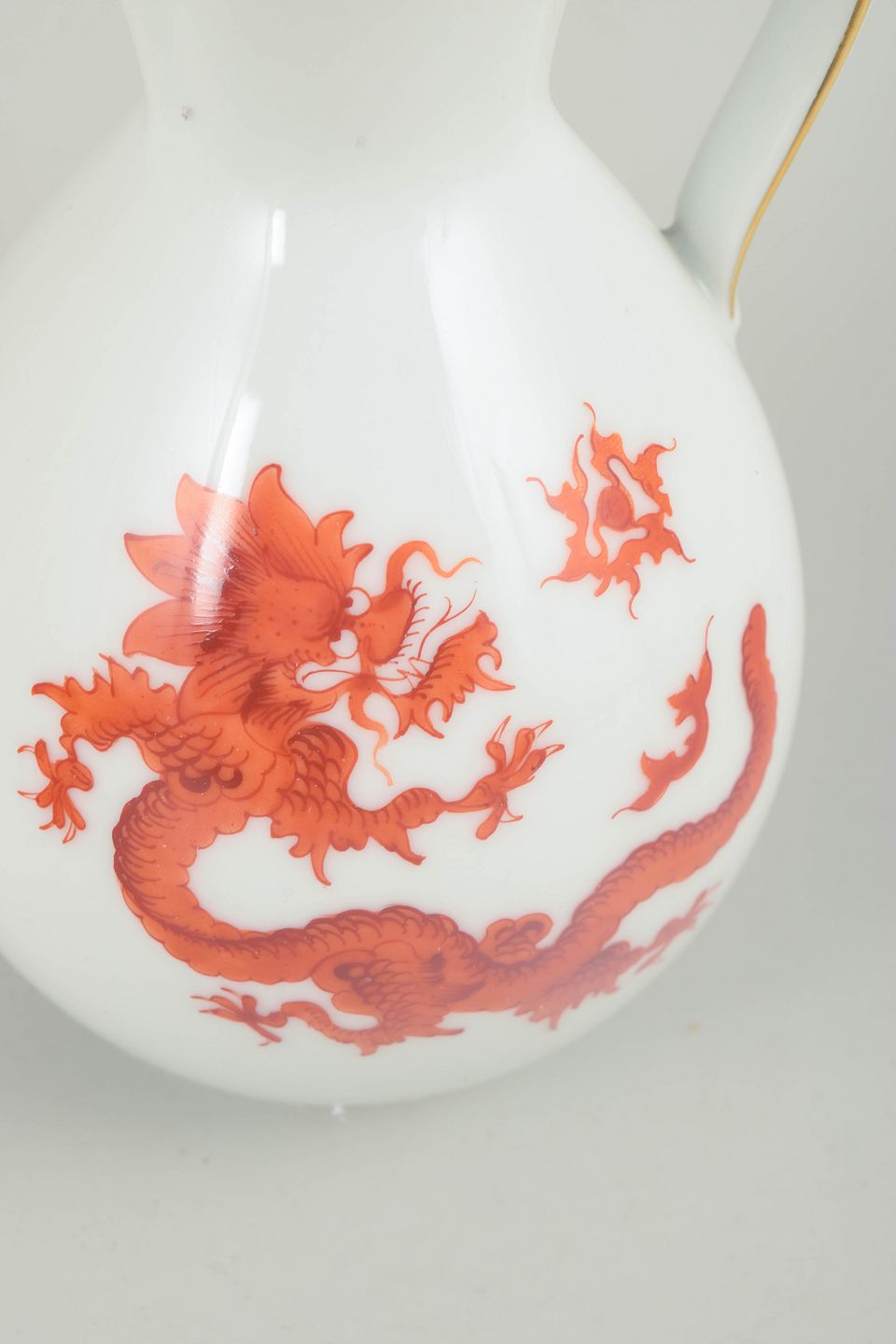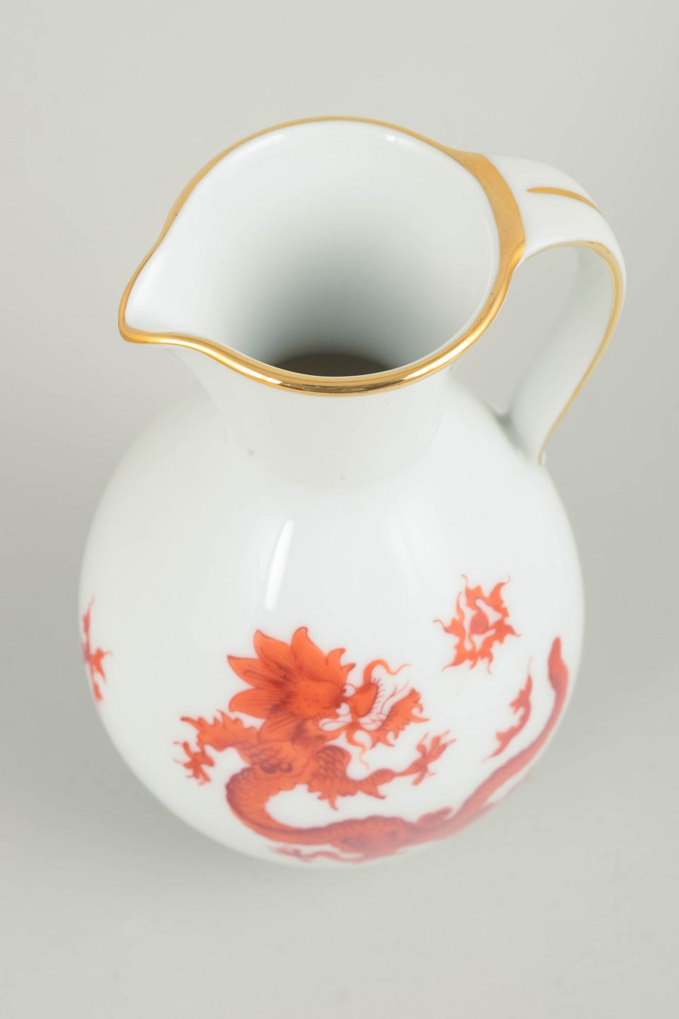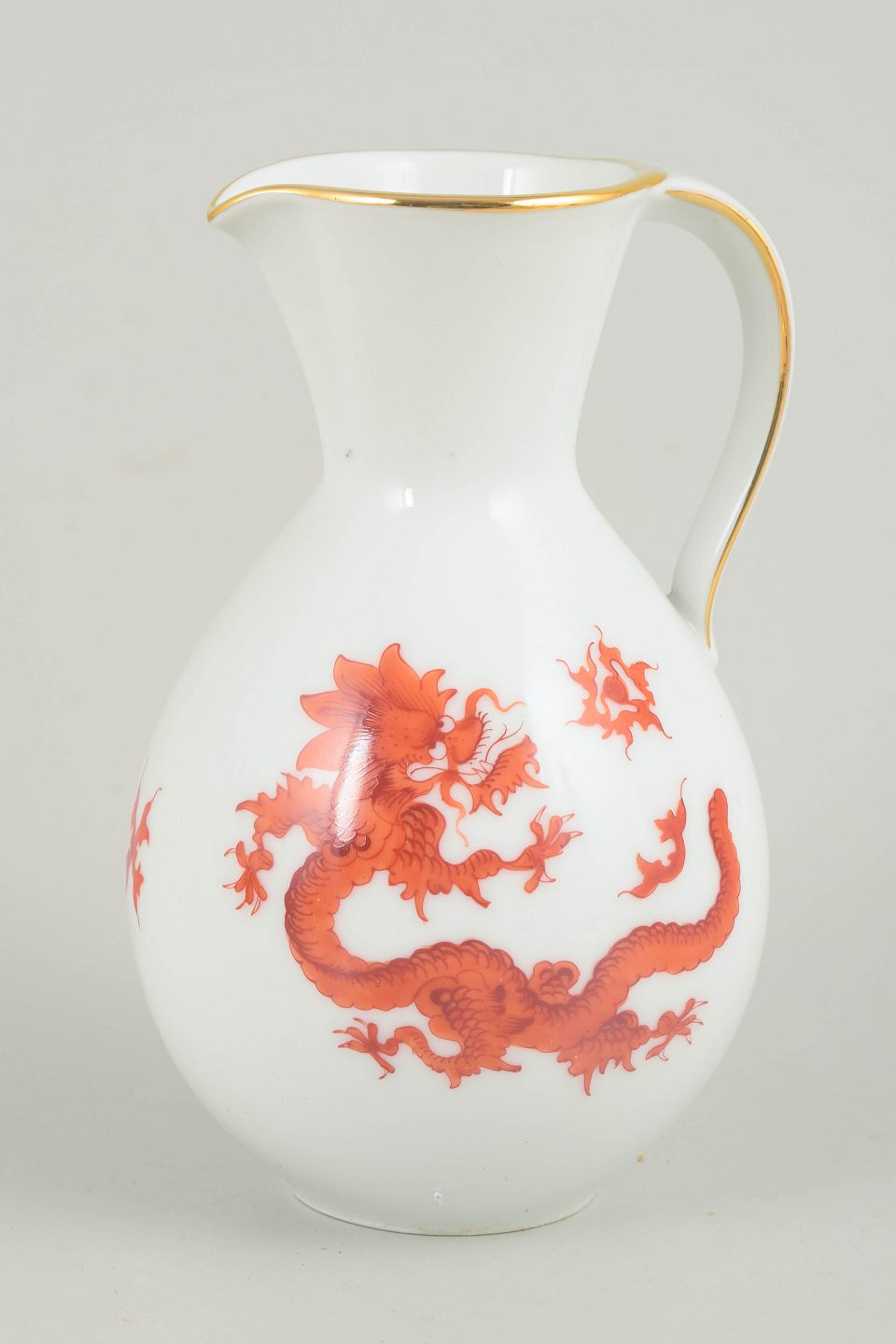 Jug with Ming dragon, Meissen area.Baluster-shaped jug in white-glazed porcelain decorated with a red Ming dragon and a gilt rim. The model was produced in the Meissen area and is not made by the Royal Meissen manufactory.