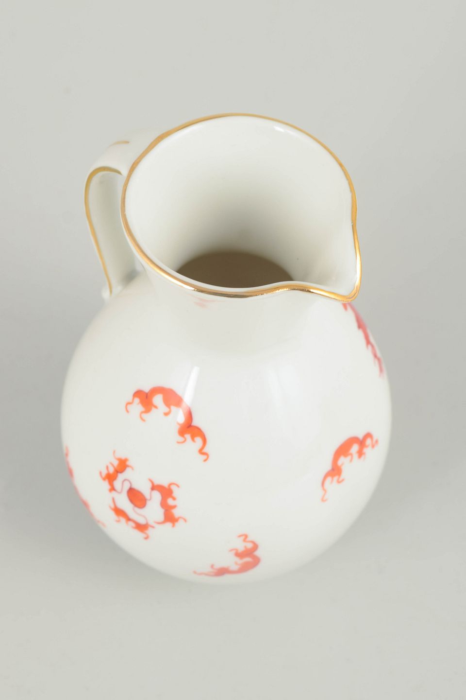 Jug with Ming dragon, Meissen area.Baluster-shaped jug in white-glazed porcelain decorated with a red Ming dragon and a gilt rim. The model was produced in the Meissen area and is not made by the Royal Meissen manufactory.