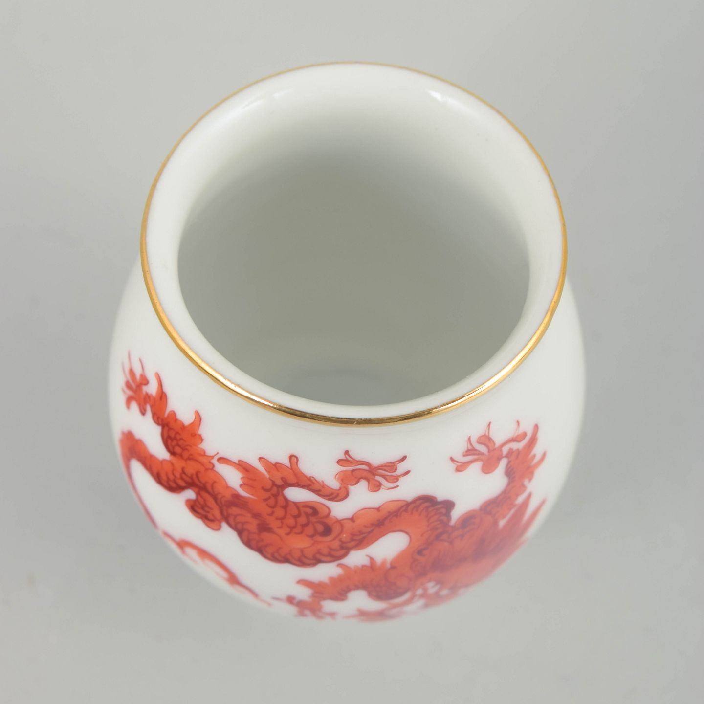 Small vase with Ming dragon, Meissen area.Small baluster-shaped vase in white-glazed porcelain decorated with a red Ming dragon and a gilt rim. The model is marked to the base and was produced in the Meissen area, but not by the Royal Meissen manufactory.