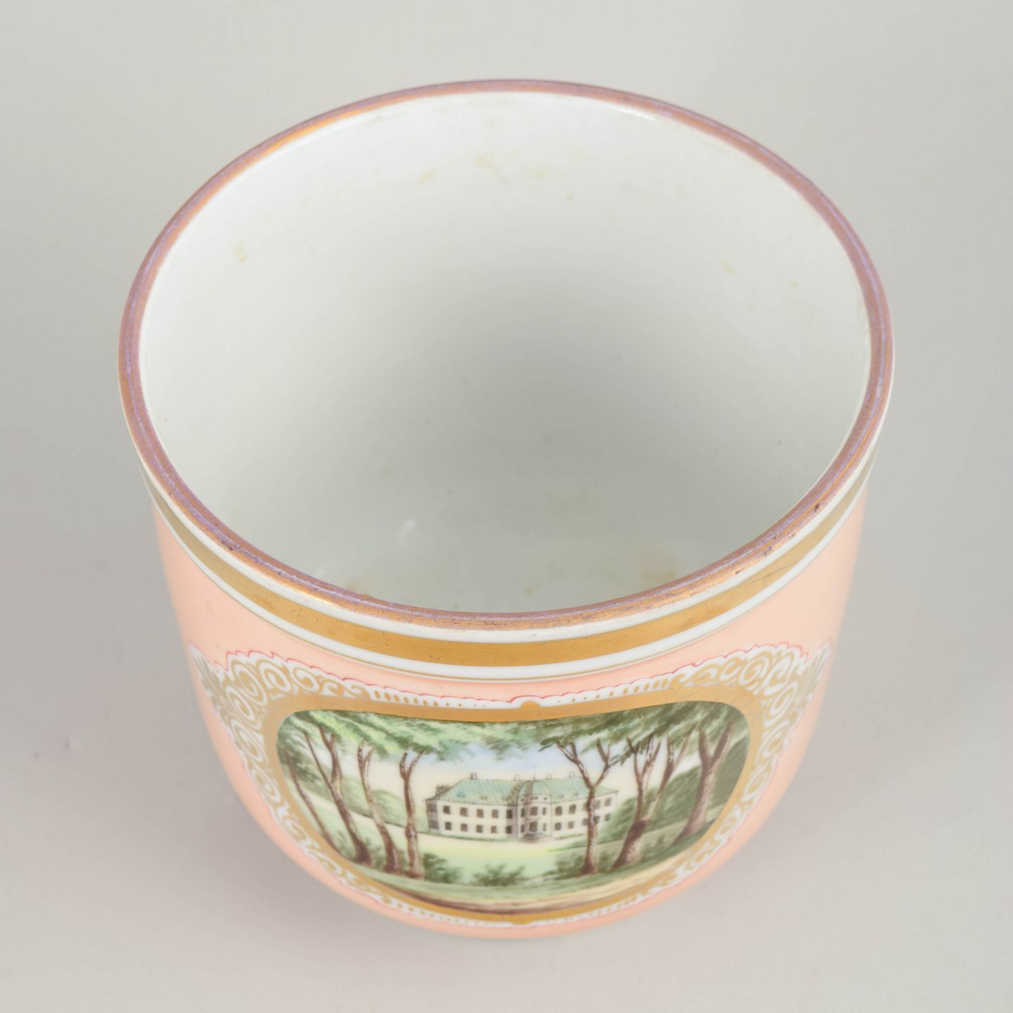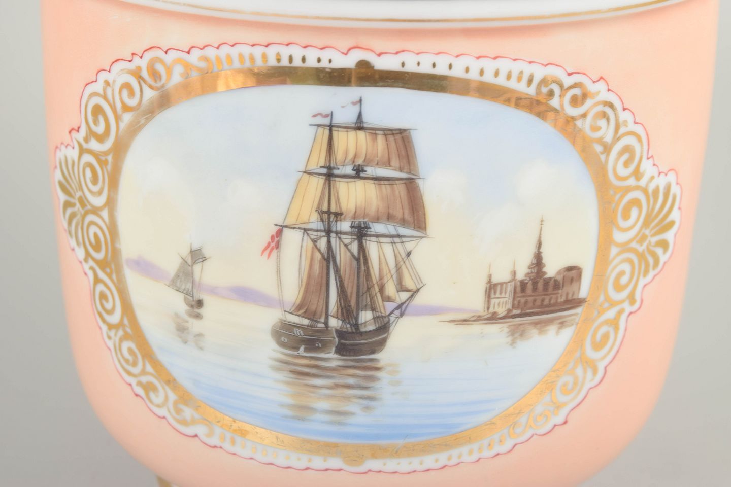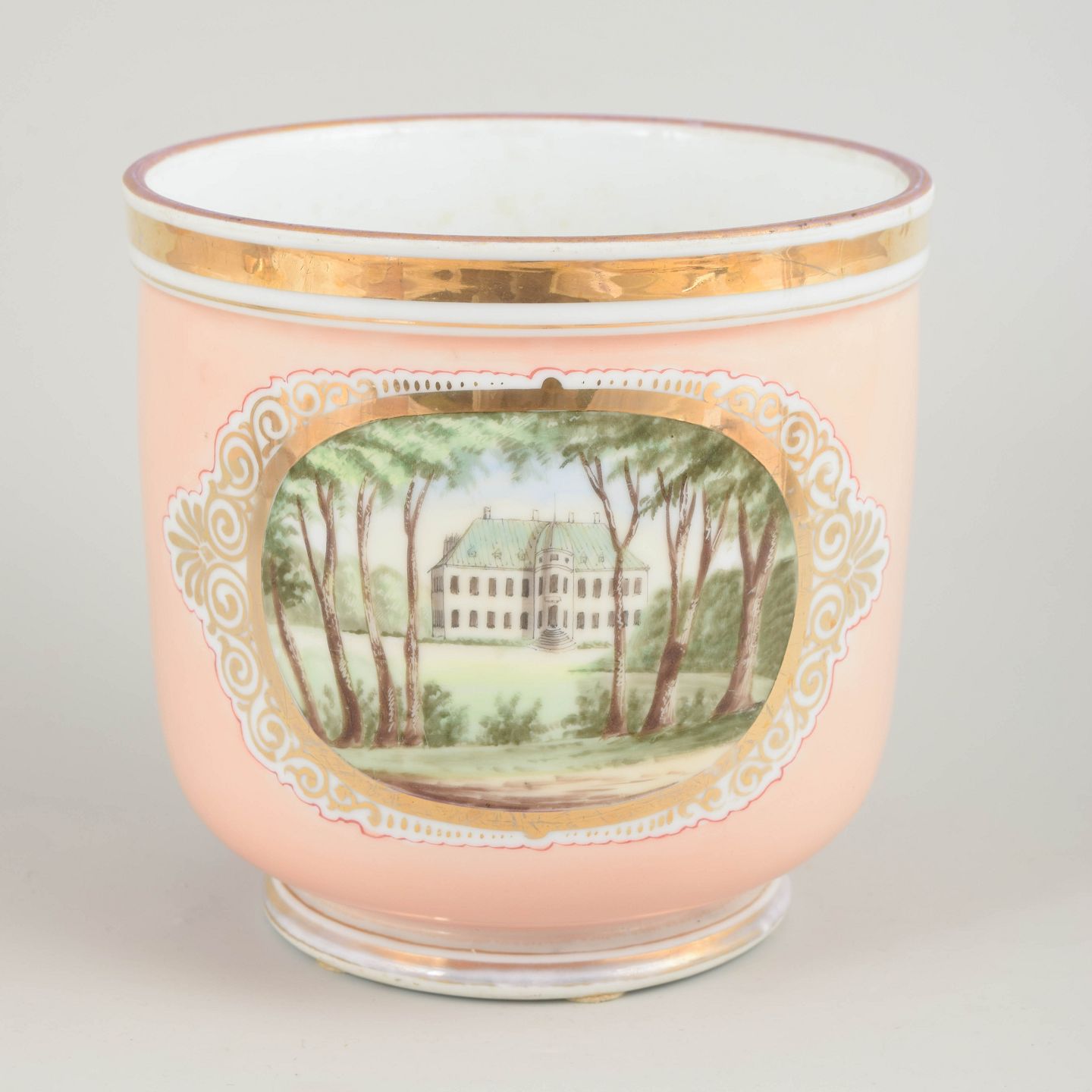 Danish Vase with Motif of Bernstorff Palace and Kronborg Castle, Hand-Painted.Round, slightly conical porcelain vase with an opalescent pink ground and a hand-painted view of Bernstorff Palace and Kronborg Castle set within a park landscape with tall trees in the foreground. The scene is framed by an ornamented cartouche and finished with a gilded border along the rim. The form is classically inspired with a low foot ring.