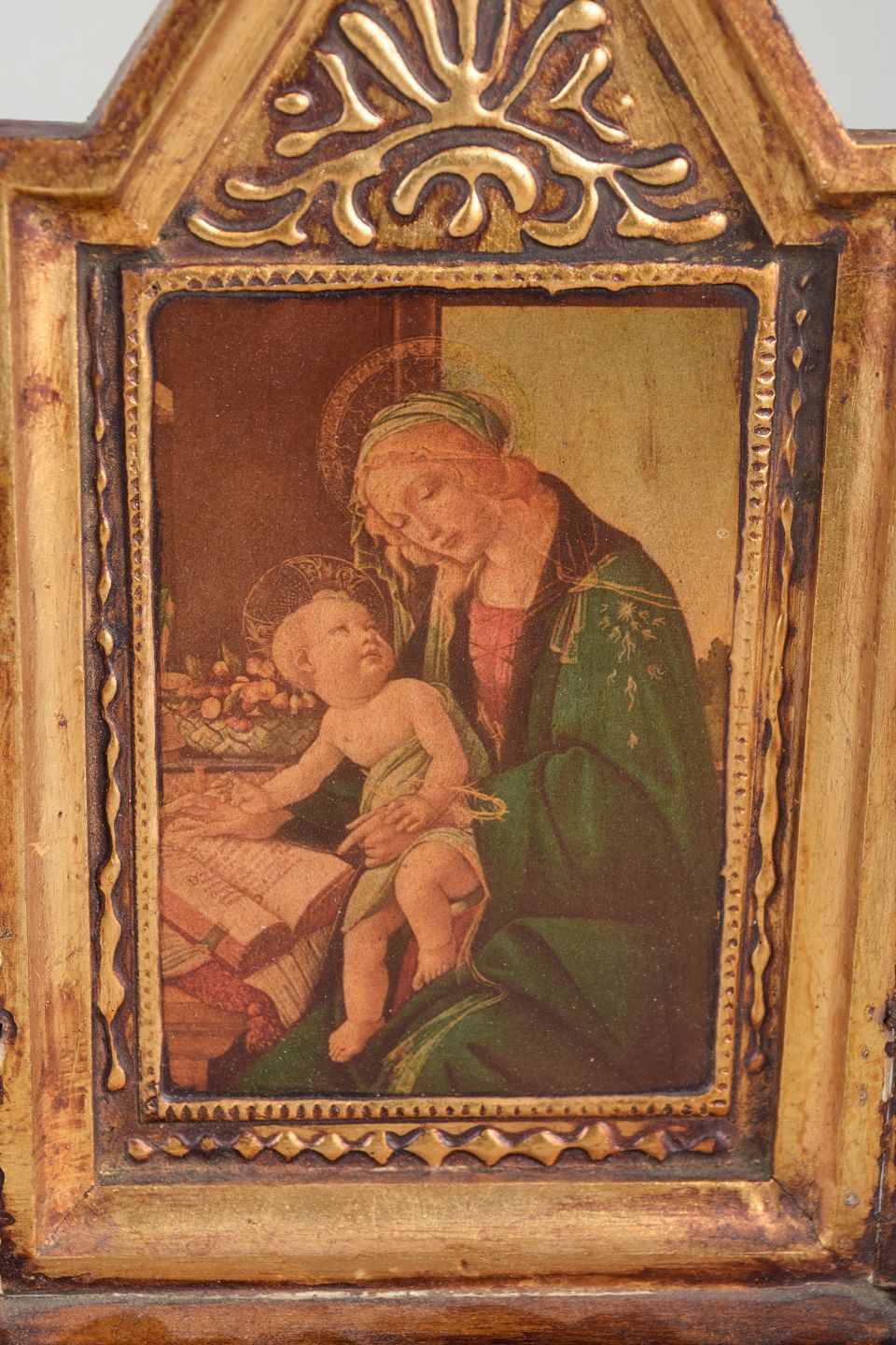 Antique Russian icon triptych, 19th century.Folding triptych with a central icon of the Madonna and Child, flanked by saint figures on the wings. Painted on wood with a gilded, ornamented frame.