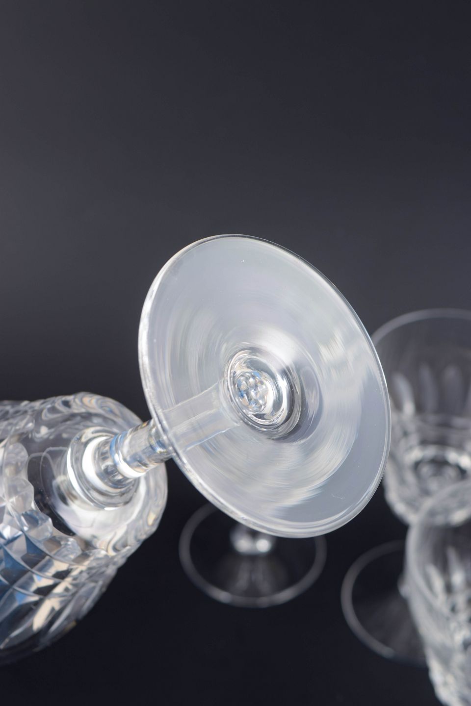 Mid-20th-century French crystal glassware is often defined by precise cutting and well-balanced proportions, using facets and flat planes to emphasise clarity and sparkle. Red wine glasses were a staple of formal table settings and home bars, and remain highly collectible today for their timeless elegance.