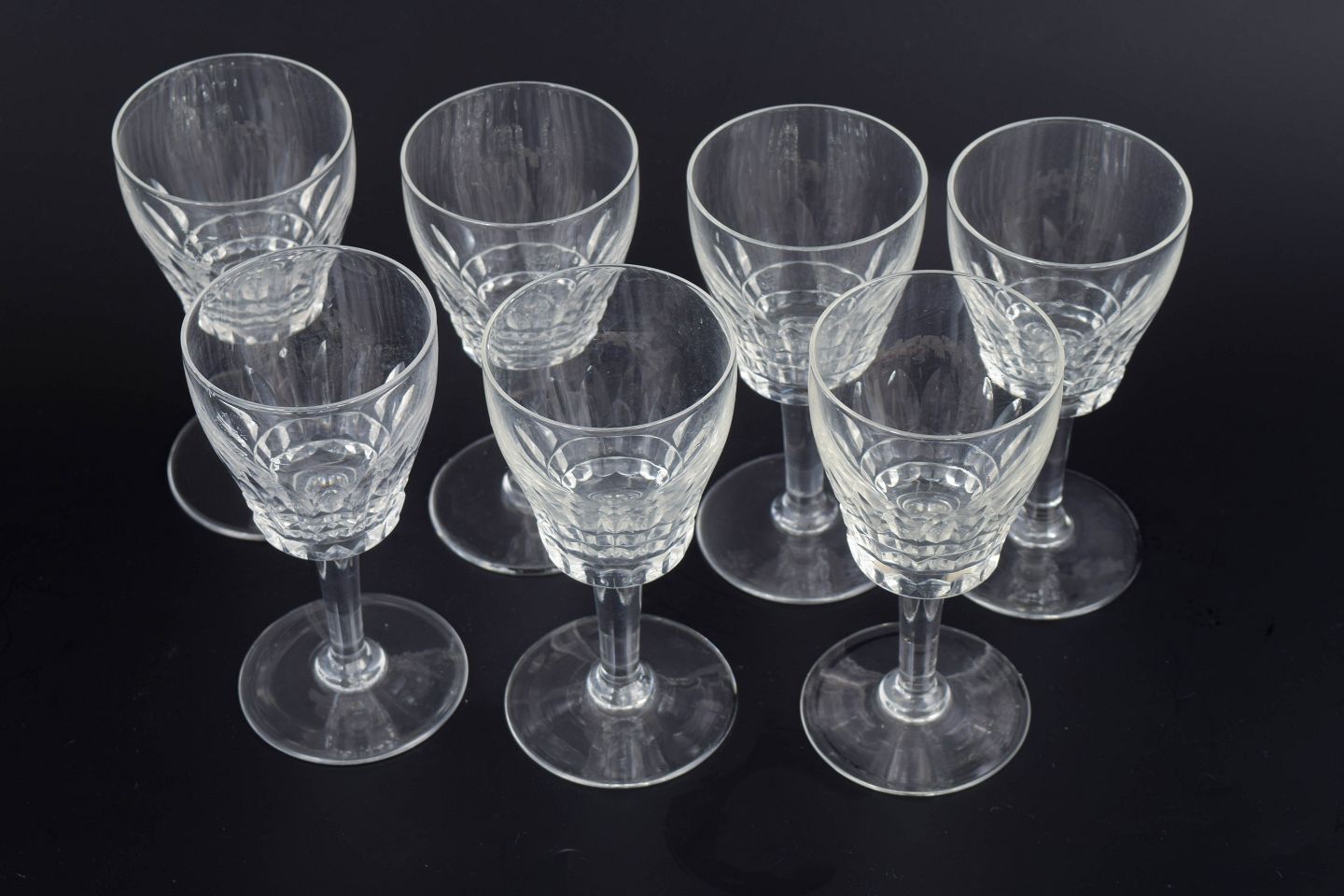 French Crystal, Set of 7 Port Wine Glasses.Set of seven French port wine glasses in clear crystal, featuring a faceted bowl and a classic stem. The cut surfaces catch the light beautifully, giving a refined mid-20th-century look.