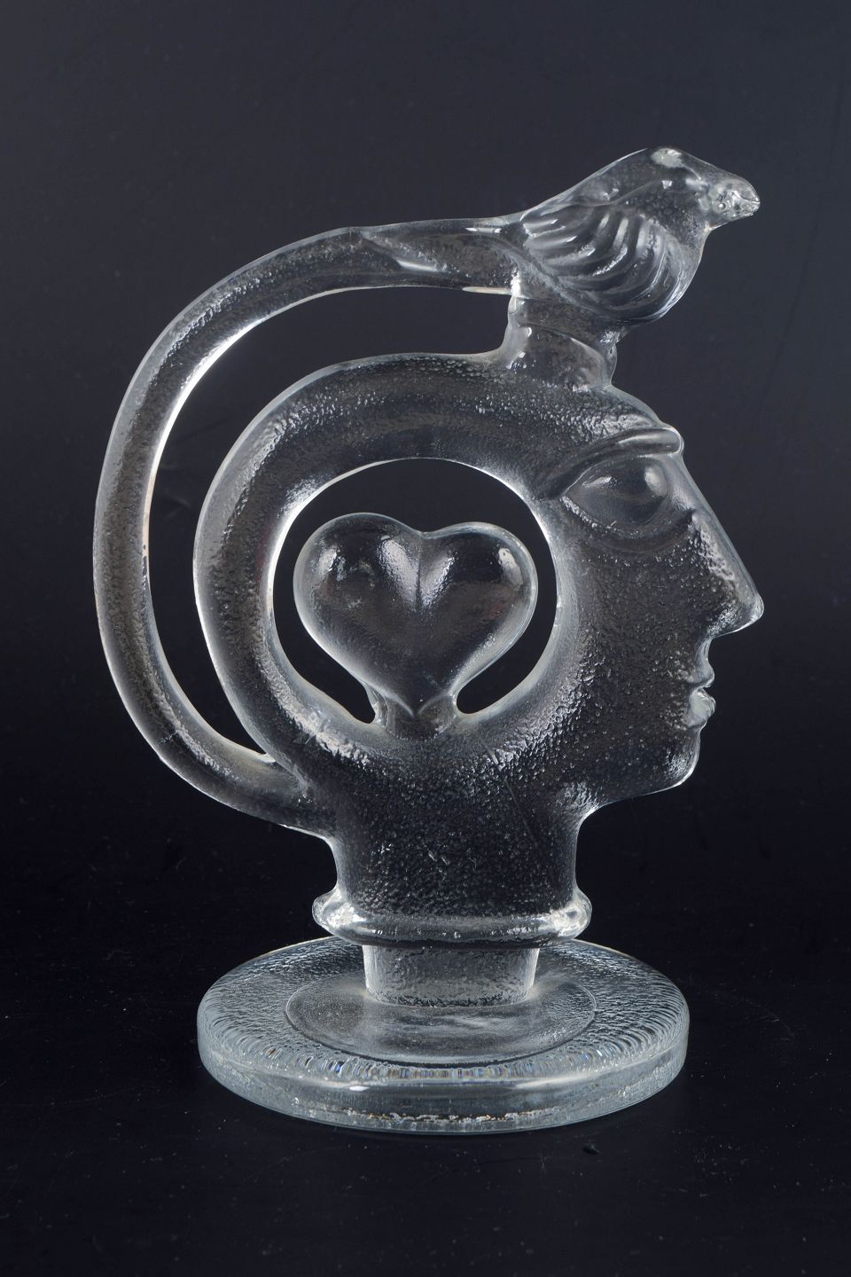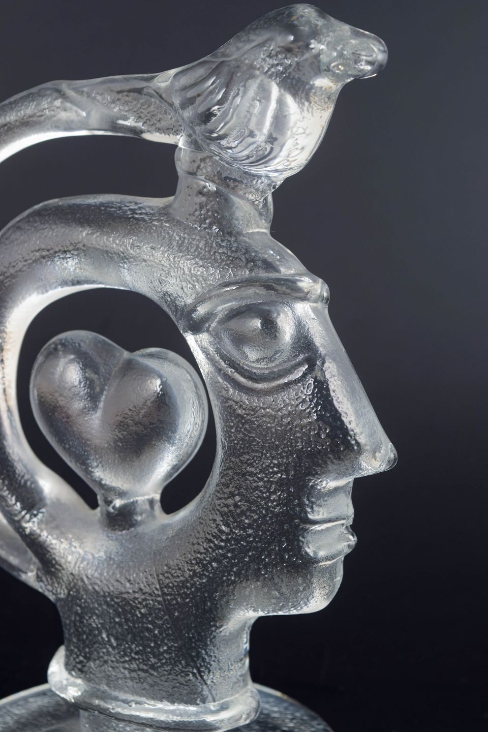 Sculptural form in clear solid glass with a stylised human head in profile, an integrated heart shape at the centre, and a bird figure positioned at the top of the curved structure. The surface shows lightly frosted areas and internal air bubbles, creating depth and optical effects in the glass. Unsigned.