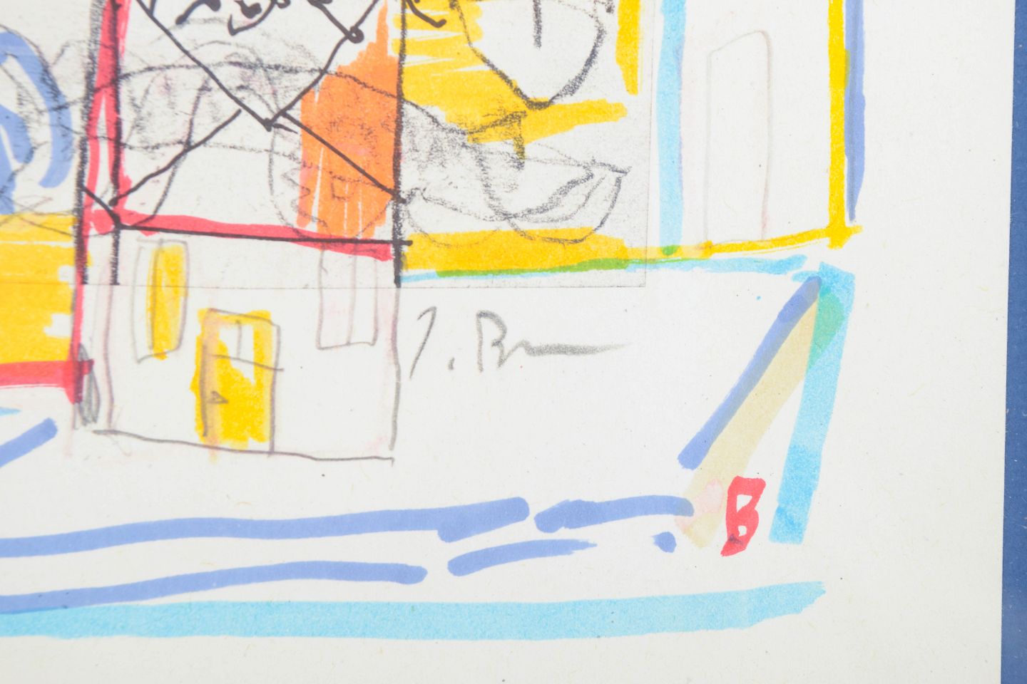 Jens Birkemose, mixed media, listed Danish artist.Abstract and figurative composition with expressive lines and areas of colour, executed in mixed media on paper. The composition combines sketch-like figures with geometric forms and transparent layers of colour. Signed.