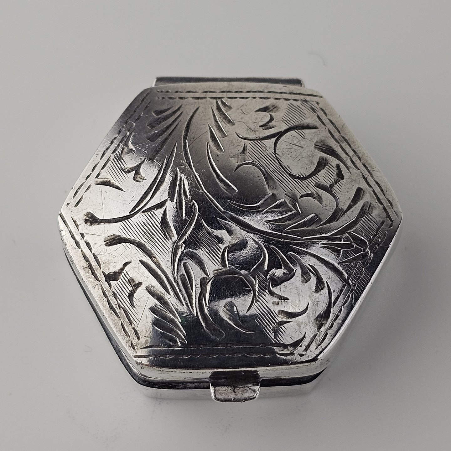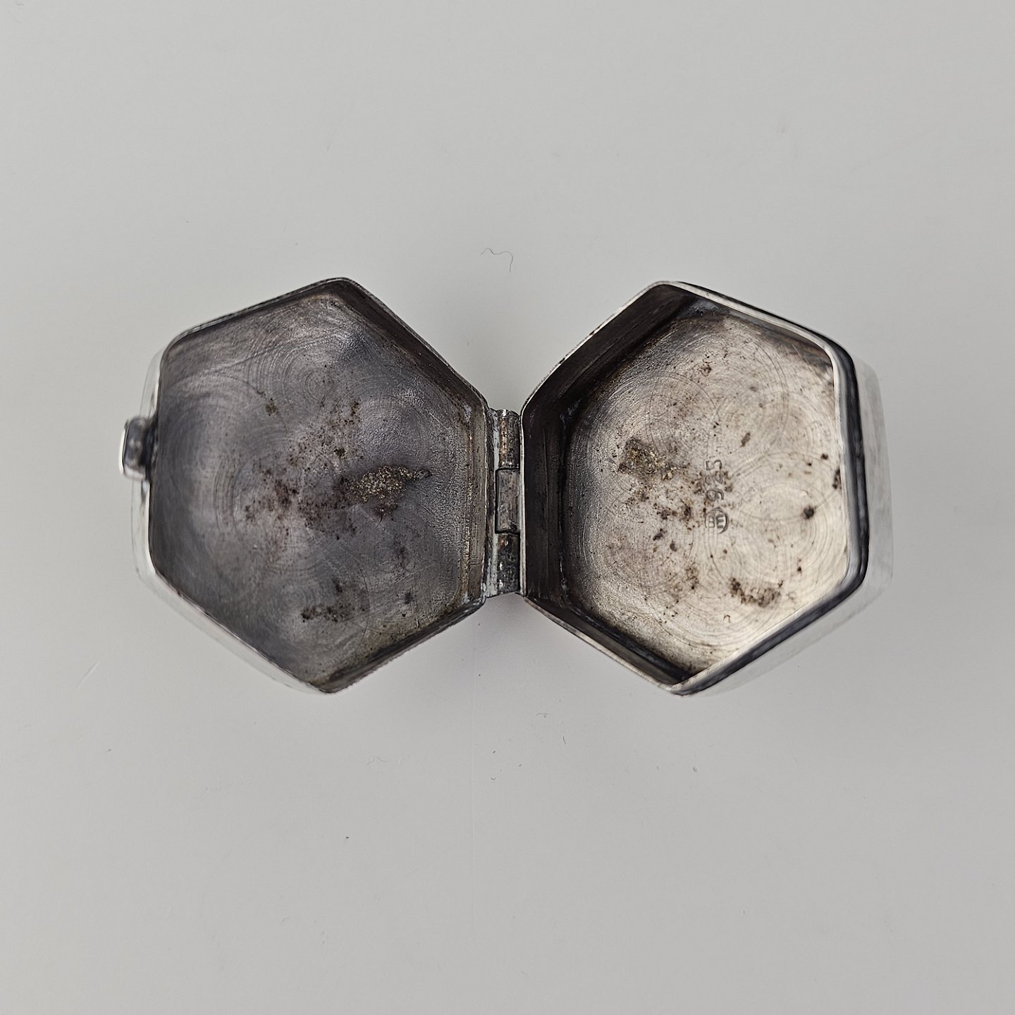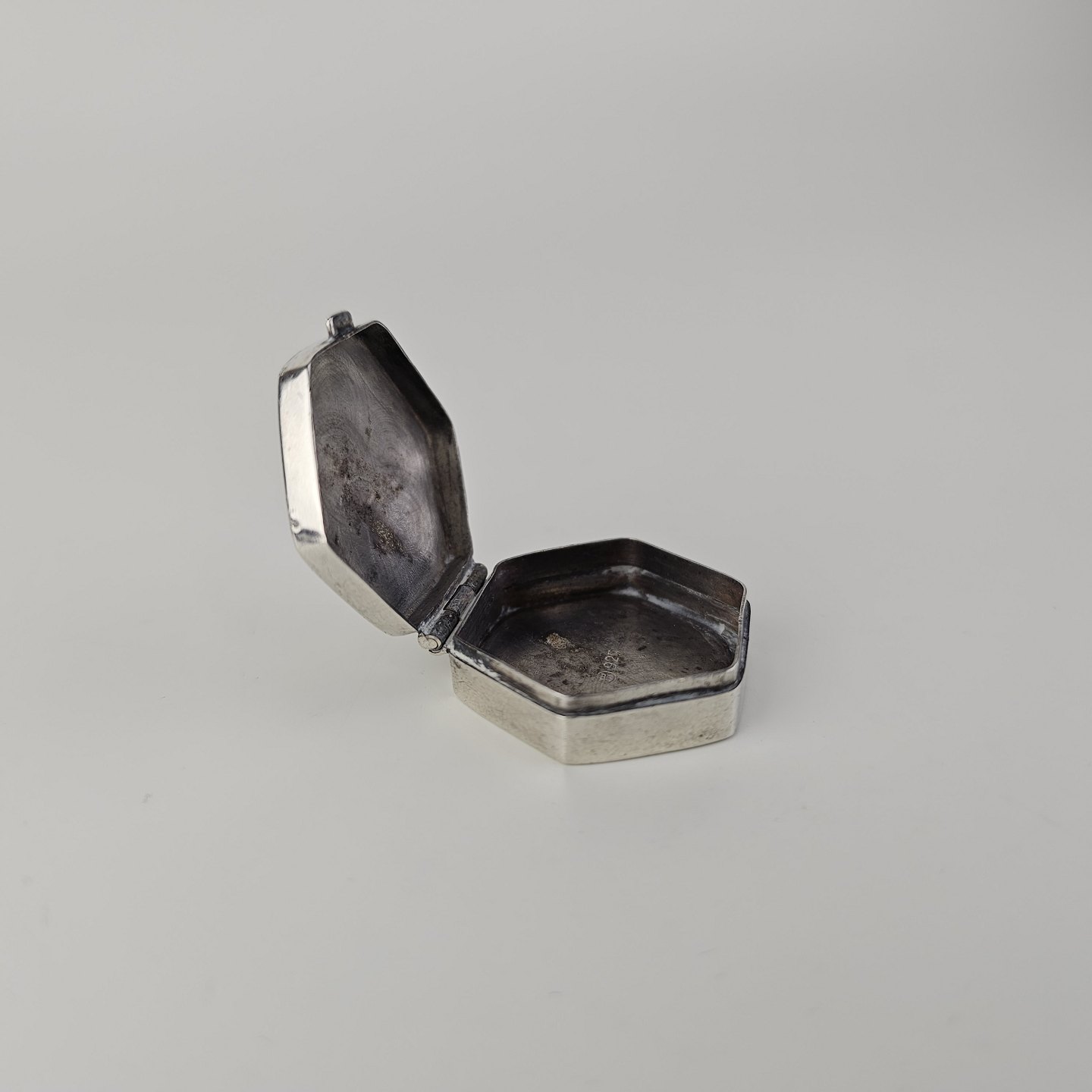 Sekskantet pilleæske i sterling sølv med indgraveret bladmotiv Stemplet 925