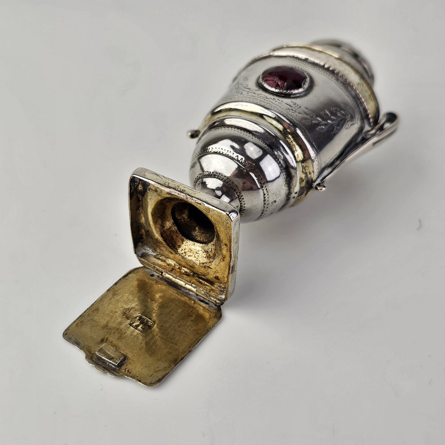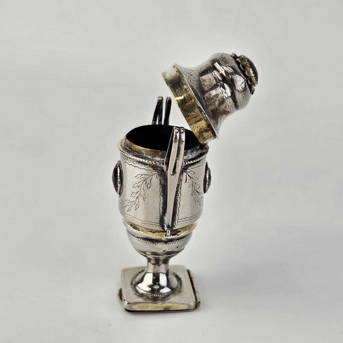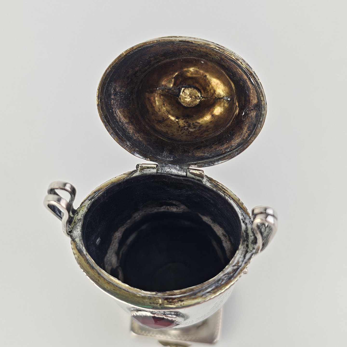 Hovedvandsæg i sølv dekoreret med forskellige smykkesten og bladværkProducent ukendt, stemplet måske JN