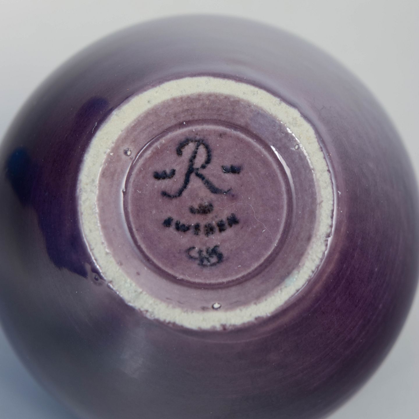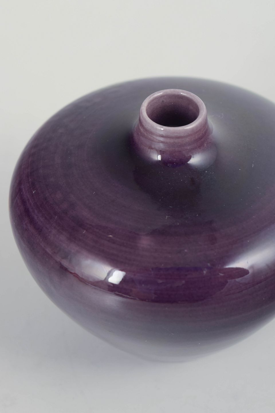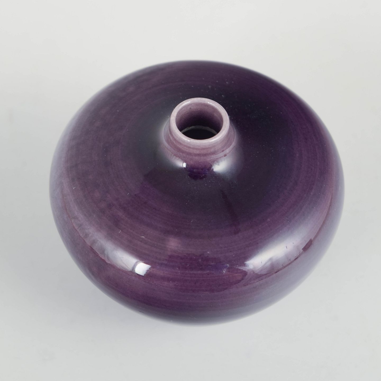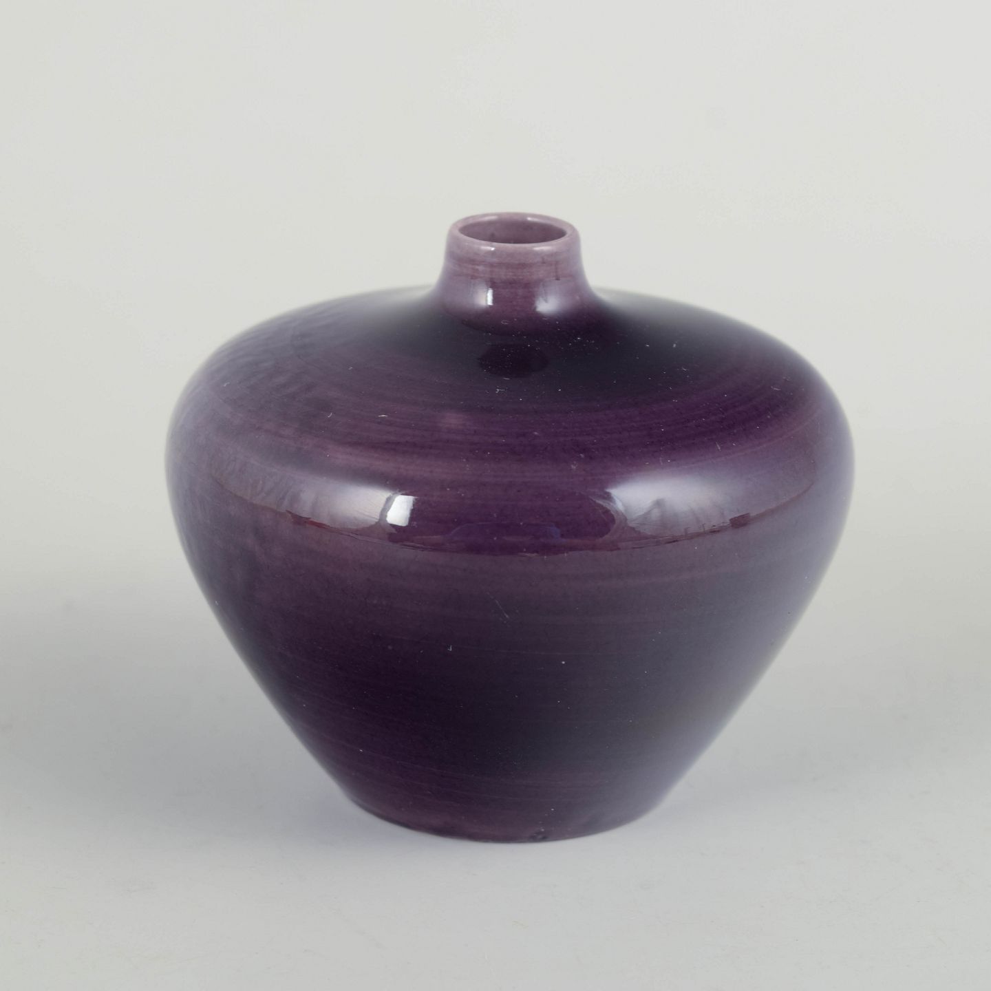 Small wheel-thrown stoneware vase with a glossy violet glaze and softly rounded form, produced in first factory quality.