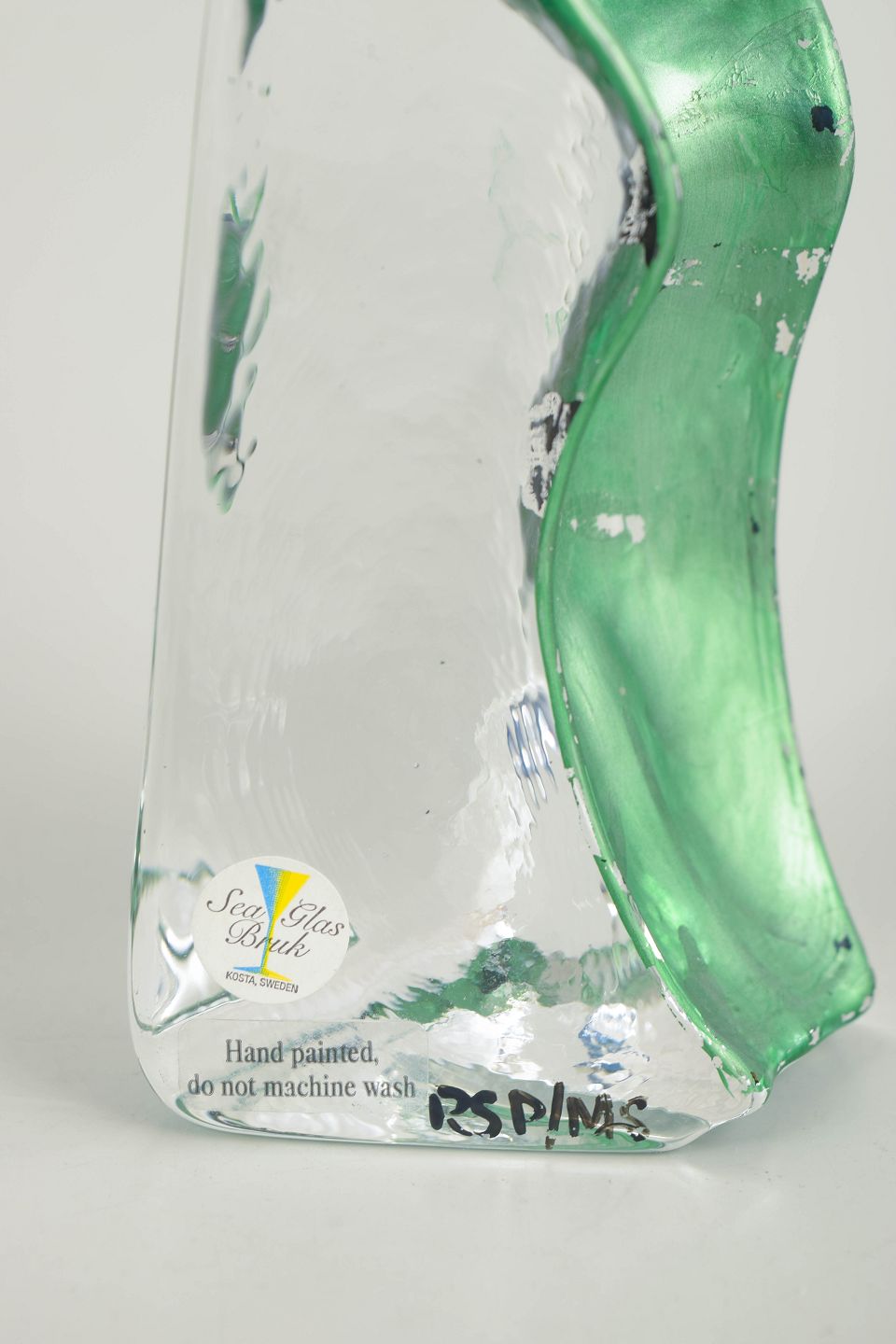Both Kosta Boda and Sea Glasbruk were known in the 1980s for Swedish art glass with strong colours and playful, figurative motifs. Production often featured mouth-blown forms with encased figures and hand-painted graphic details, giving the works a distinctive and recognisable character. Such pieces combine studio glass tradition with decorative design and are today sought after by collectors.
