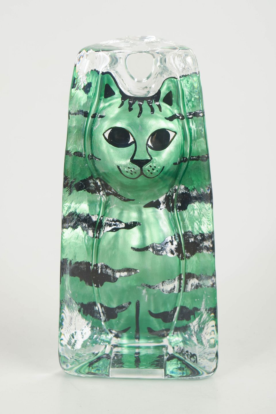 Renate Stock-Paulsson for Kosta Boda / Sea Glasbruk, cat figure.Mouth-blown glass figure in clear glass with an encased green cat motif, hand-painted details, and the model formed in relief inside the glass.
