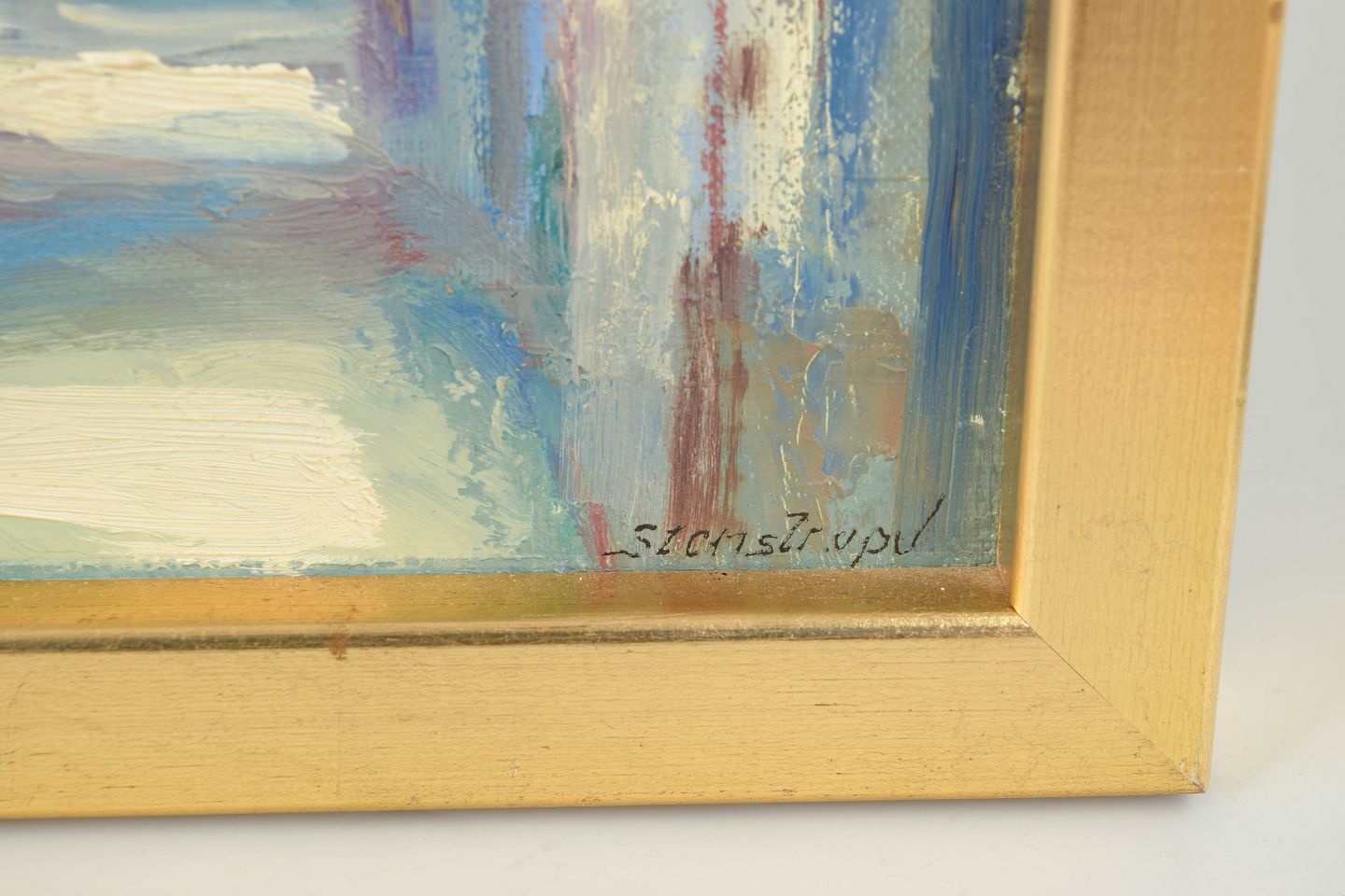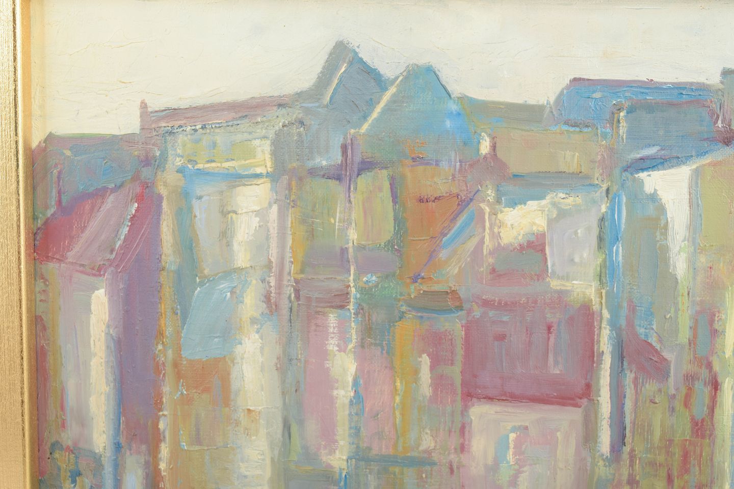 Villy Stenstrup Jensen (b. 1919-1995), painting, listed Danish artist.Modernist cityscape executed in oil with simplified architectural forms and a restrained colour palette, signed lower right.