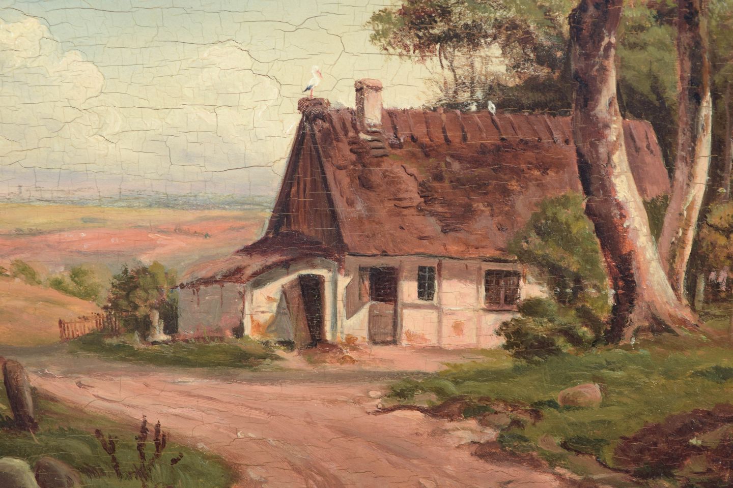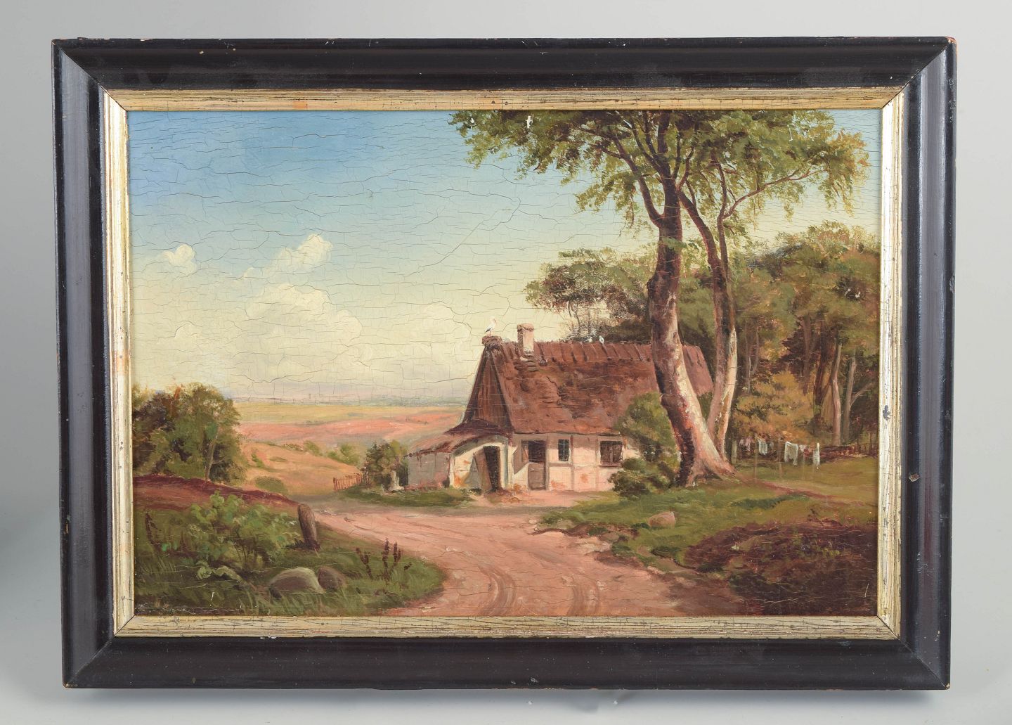 The Danish Golden Age is characterised by poetic and naturalistic depictions of landscape and everyday rural life, often centred on cottages, roads, and clusters of trees. Artists of the period favoured a calm and harmonious visual language with balanced colour and careful attention to light and atmosphere. Oil on wood or mahogany was frequently used for small-format works with refined detail.