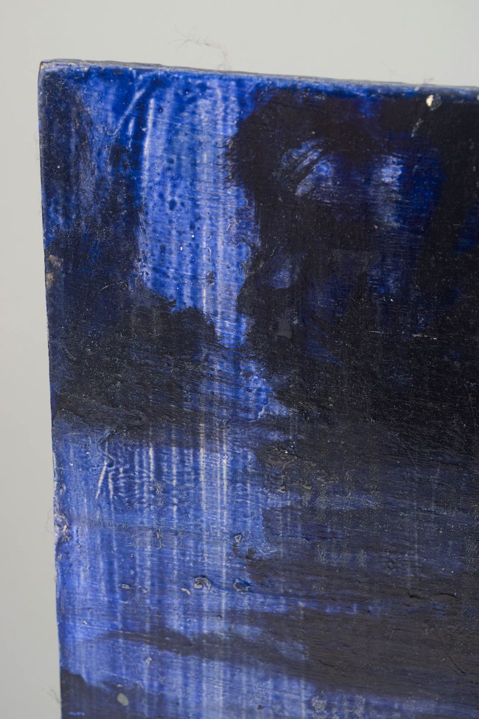 Johan Damm, oil painting, listed Swedish artist.Abstract and atmospheric composition with horizontal, reflective colour fields in blue and dark tones, executed in oil on board.