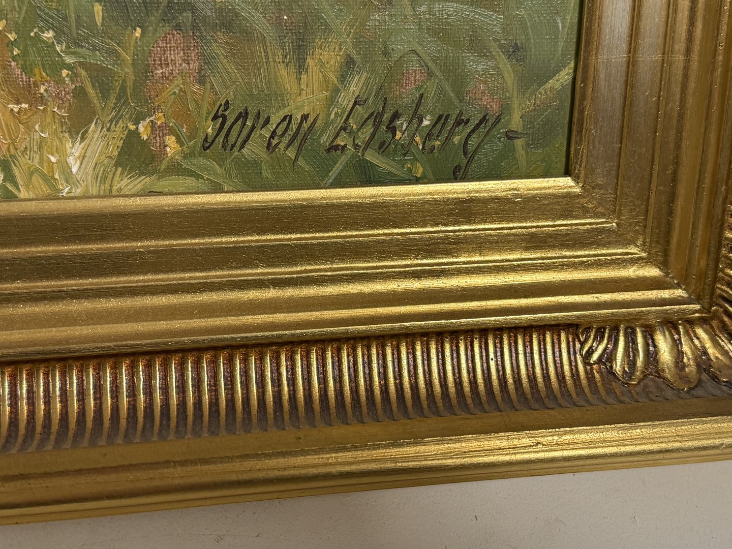 Søren Edsberg (b. 1945), Oil painting on canvas with motif from the countryside, Dimensions with frame: 53x43cm, small defect on the frame otherwise good conditionStock: 1