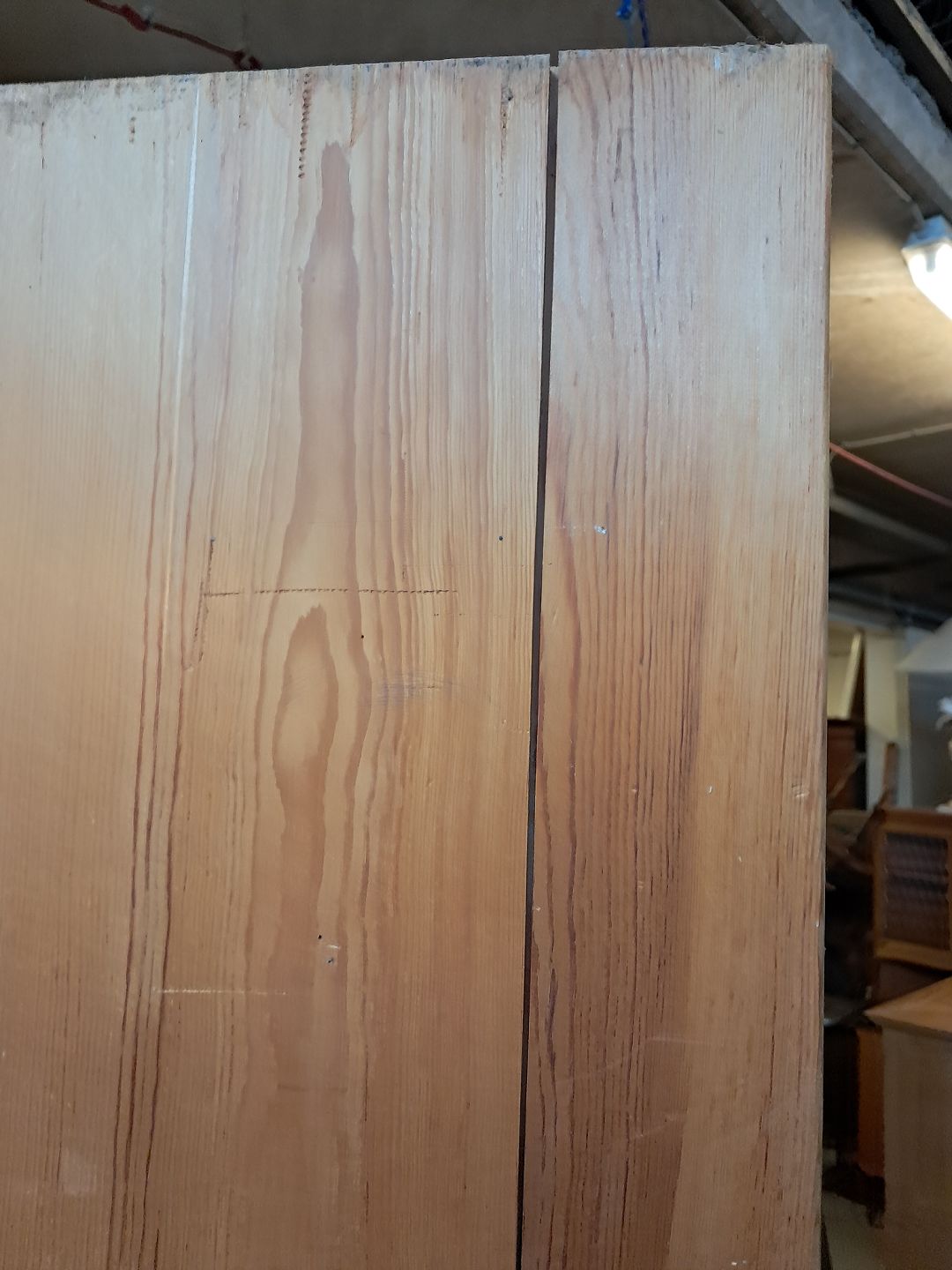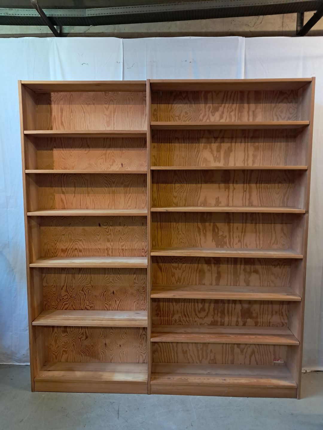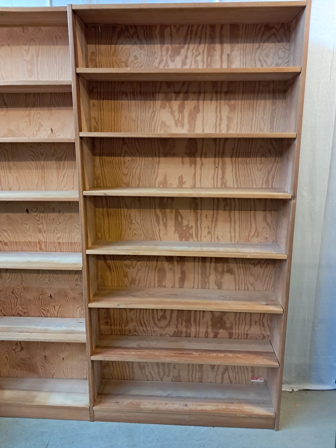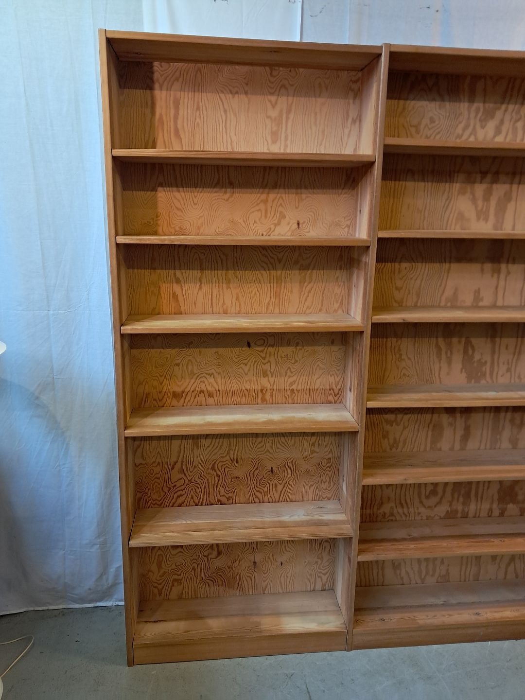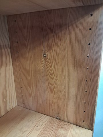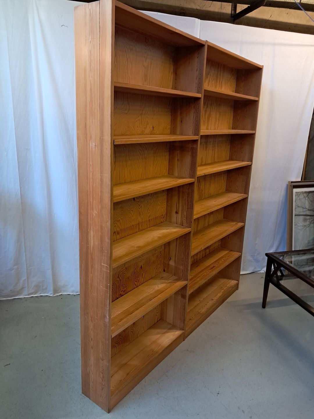 Reol i massivt fyrretræ, fra 1980erne.Den har brugsspor og justerbare hylder.